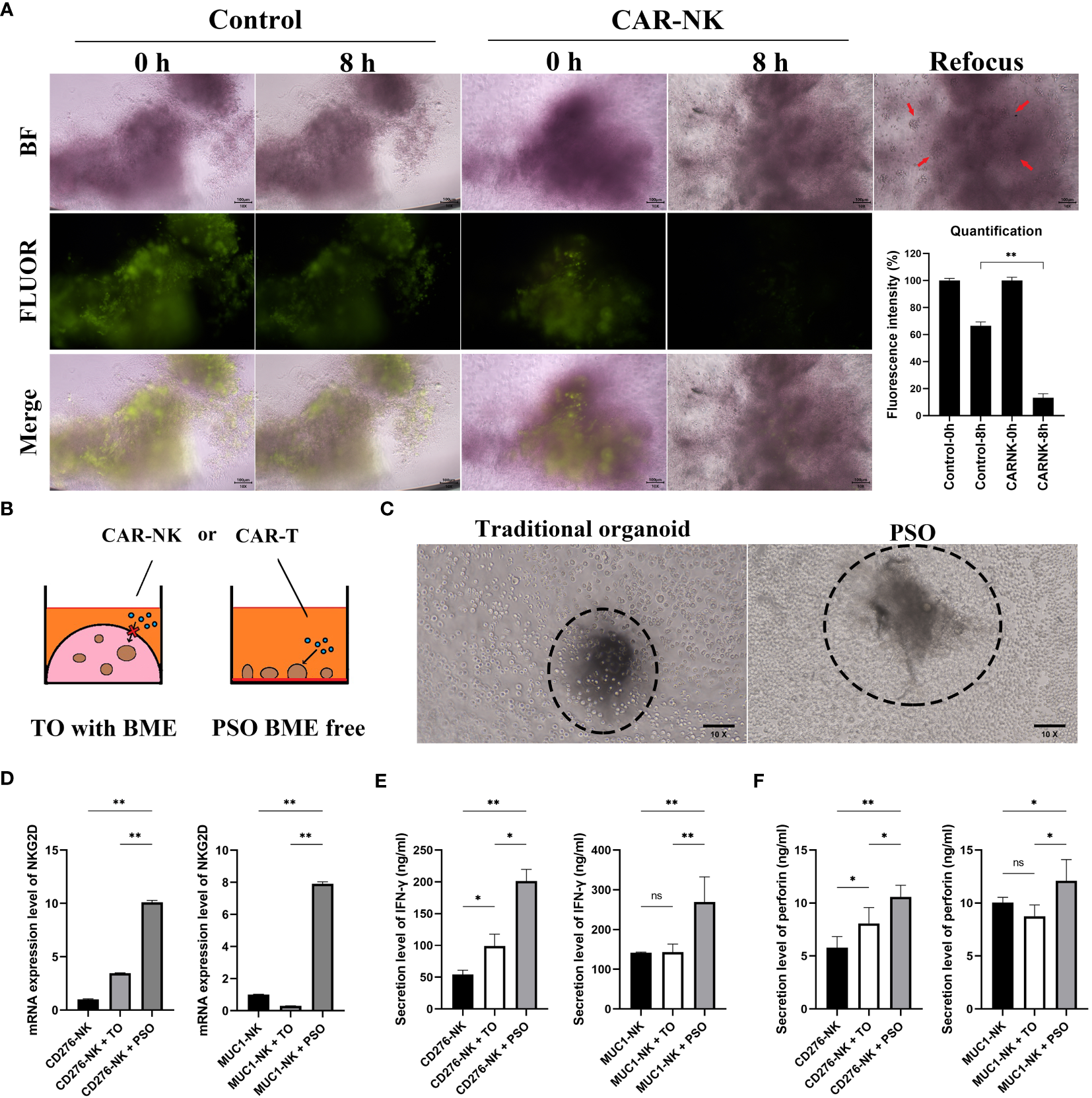 The potential of PSO for cell therapies testing. (A) To evaluate the efficacy of PSOs in cell therapies, we conducted fluorescent staining (green) of live cells after co-culturing with CAR-NK cells, and obtained fluorescence quantification results. The snap point was recorded at 0th and 8th hour. (B, C) We also present a diagram (B) and micrograph (C) for a comparison of cell therapies testing using traditional organoids embedded in BME or PSOs in BME-free conditions. (D) We analyzed the mRNA expression level of NKG2D in CAR-NK cells when co-cultured with PSOs or traditional organoids. (E, F) We also evaluated the secretion level of IFN-γ (E) and perforin (F) from CAR-NK cells when co-cultured with PSOs or traditional organoids. Abbreviations used in this study include BF (bright field), FLUOR (fluorescent staining), TO (traditional organoid). “*”, statistically significant difference with the value of p < 0.05. “**”, p < 0.01.