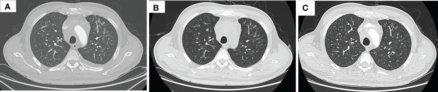 Thorax CT imaging indicates pulmonary inflammation after treatment of tislelizumab plus albumin-bound paclitaxel, which disappears in approximately 2 months when monitored closely. (A) Imaging on 16 July 2020, after two cycles immunotherapy, inflammation focally affecting the left lung; (B) imaging on 22 July 2020, 1 week after the time of (A), the inflammation is still in the left lung; (C) imaging on 9 September 2020, after three cycles immunotherapy, the inflammation basically subsided.