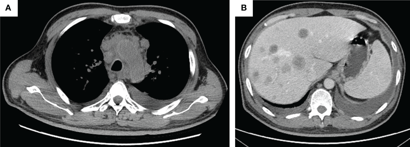 The tumor progression by thorax and abdomen CT imaging. (A) Thorax imaging indicates enlarged lesions in the mediastinum on 16 March 2021; (B) abdomen imaging on 16 March 2021 indicates multiple live metastases.