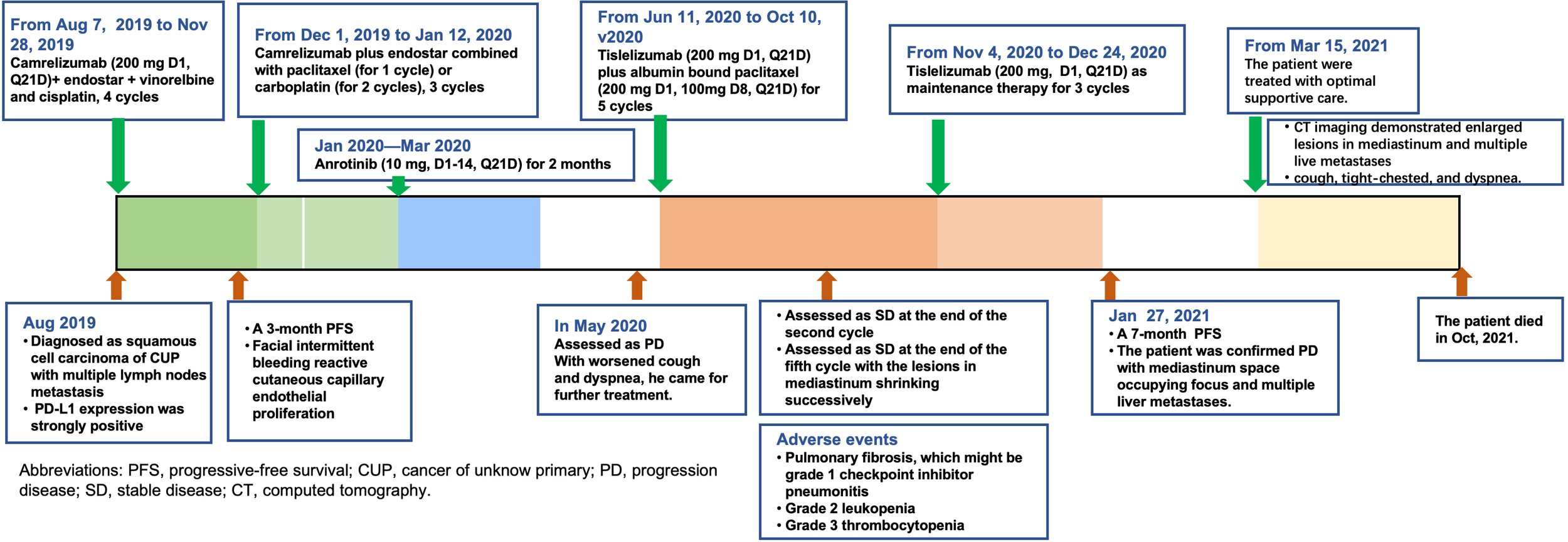 A 50-year-old male patient was admitted to the hospital for further treatment after multi-line treatment of low differentiated squamous cell carcinoma in the mediastinum diagnosed 8 months before. The patient was previously in good health without smoking history and no family history of cancer. In August 2019, the patient went to a local hospital for cough and dyspnea for 2 weeks. Computed tomography (CT) screening and positron emission tomography (PET)/CT revealed multiple swollen lymph nodes in the mediastinum. Hypermetabolic foci were not detected in other remaining sites of the body. The patient was diagnosed with squamous cell carcinoma of unknown primary origin with multiple lymph nodes metastasis based on the histopathological examination of biopsy specimens. According to results of analyses of blood and tissue samples by next-generation sequencing, the PD-L1 expression was strongly positive in 90% of tumor cells and PD-L1 combined positive score (CPS) was 90. In addition, the patient was characterized with a tumor mutation burden (TMB) of 1.79 MUts/Mb and a microsatellite stable phenotype.