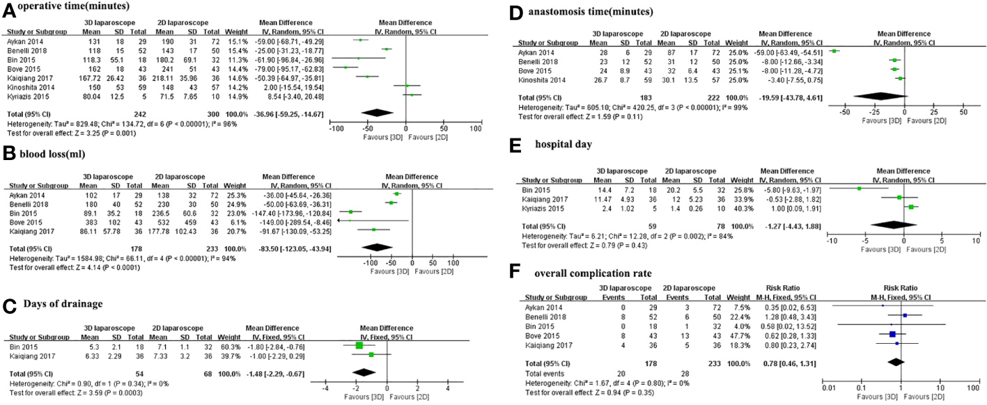 Forest plot comparing the perioperative outcomes of 3D and 2D LRP. (A) Operative time; (B) Anastomosis time; (C) Blood loss; (D) Hospital day; (E) Days of drainage; (F) Overall complication rate.
