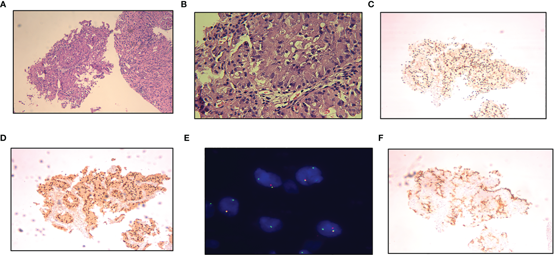 (A, B) Pathology of left renal needle biopsy, papillary cells arrangement, marked cellular eosinophilia (H&E, A× 200, B×800). (C) TFE3 overexpression (×200). (D) Positive for PAX8 (×200). (E) Tumor cells have split signals in fluorescence in situ hybridization analysis. One yellow fused signal, one pair of red-green separated signals can be seen. (F) Positive for PDL1 (×200).