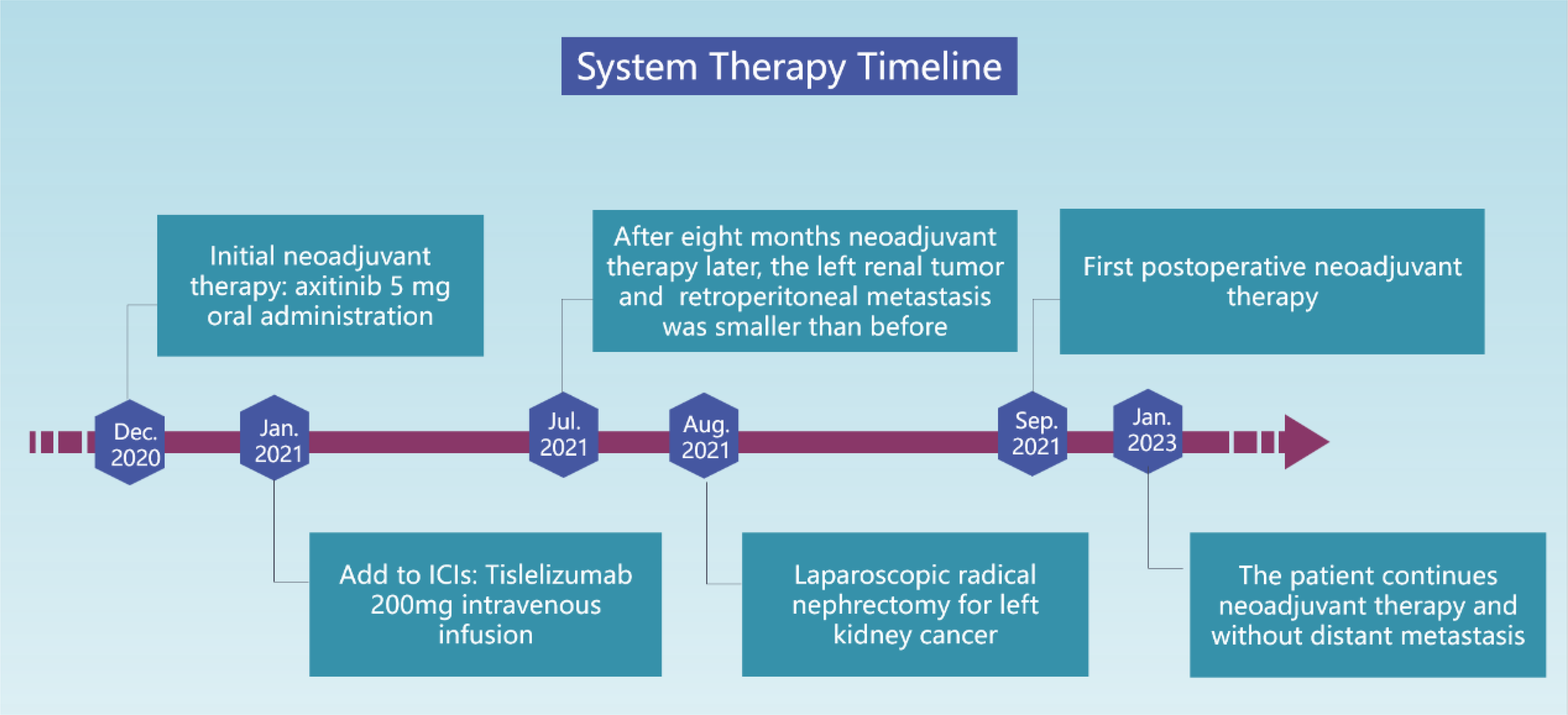 The tumor was classified as IV (pT3aN0M1) based on the pathologic stage of the American Joint Committee on Cancer (AJCC, 8th edition, 2017). The postoperative pathology revealed that the tumor was WHO/ISUP grade 4, and it appeared as a distinct papillary structure (Figure 4A). The HE staining confirmed that the metastatic foci were composed of tumor tissues (Figure 4B). Additionally, the FISH test showed that most tumor nuclei had separated red and green signals, indicating a rearrangement of the TFE3 gene. The patient suspended tislelizumab therapy due to impaired liver function more than a month after the surgery and continued taking VEGFR-TKI. In September 2021, the patient resumed neoadjuvant therapy with axitinib and tislelizumab. The systemic therapy timeline is presented in Figure 5. As of now, the patient has survived for 30 months post-surgery and remains in stable condition without any recurrence of tumor or distant metastases (Figure 1D).