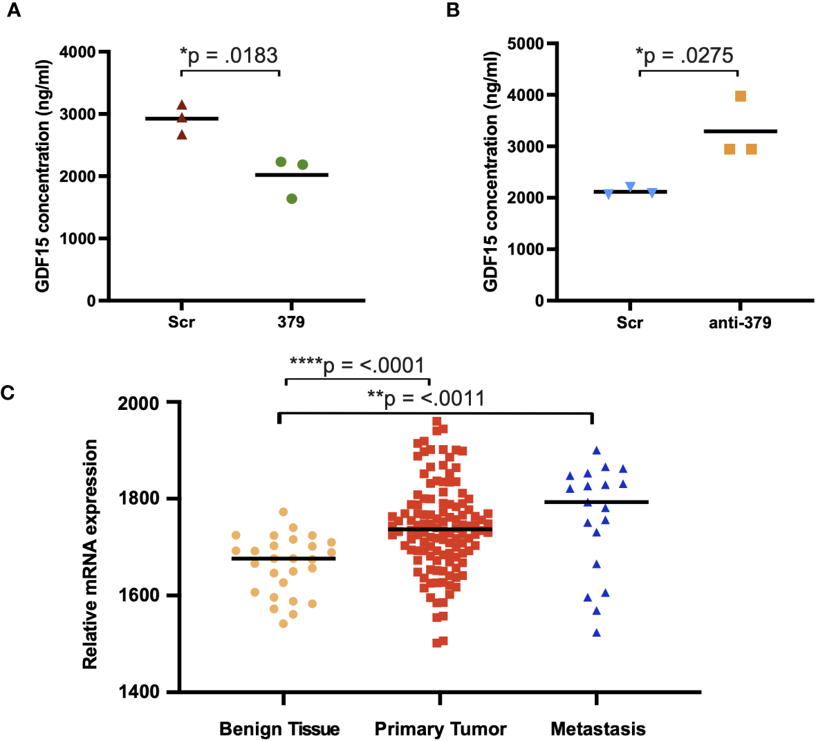 GDF15 expression in MG-63 cells grown in miR-379/anti-miR-379 conditioned media. Media from PC3 cells transduced with miR-379 (A) and 22Rv1 cells transduced with anti-miR-379 (B) were added to MG-63 cells before ELISA. The red/blue triangles denote Scr-control conditioned media, and the green circles/orange boxes denote miR-379 and anti-miR-379 conditioned media. Experiments were performed three times, and representative data is shown. Individual values of biological triplicates are shown as red or blue triangles, green circles, and orange squares. The relative levels of GFRAL are also shown (C) in an external patient cohort consisting of mRNA transcript levels of benign tissue from 28 men without PCa (yellow circles), 122 men with PCa (red squares), and 19 men with bone metastasis (blue triangles). Unpaired two-tailed Student’s t-tests were performed to compare the treatment groups to one another; *p < 0.05; **p < 0.01; ****p < 0.0001. A Shapiro–Wilk test was used to confirm normal distribution in the groups. Only statistically significant p values are shown in the figure.