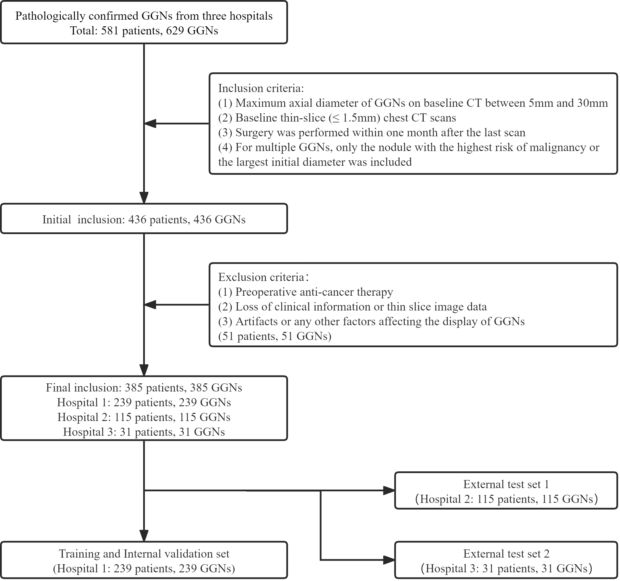 The GGNs with pathological confirmation were retrospectively collected from the three medical institutions from January 2019 to December 2021 (Hospital 1), January 2016 to December 2018 (Hospital 2), and January 2020 to June 2022 (Hospital 3). The inclusion criteria were as follows (1): Maximum axial diameter of GGNs on baseline CT between 5mm and 30mm; (2) Baseline thin-slice (≤ 1.5mm) chest CT scans; (3) Surgery was performed within one month after the last scan; (4) For multiple GGNs, only the nodule with the highest risk of malignancy or the largest initial diameter was included. The exclusion criteria were as follows: (1) Preoperative anti-cancer therapy; (2) Loss of clinical information or thin slice image data; (3) Artifacts or any other factors affecting the display of GGNs. All CT images in this study were plain scan images. Our criteria for benign and malignant evaluation were based on the 2021 edition of the World Health Organization classification recommendations (24); therefore, the precursor glandular lesions (i.e., atypical adenomatous hyperplasia, AAH, and adenocarcinoma in situ, AIS) were classified as benign.