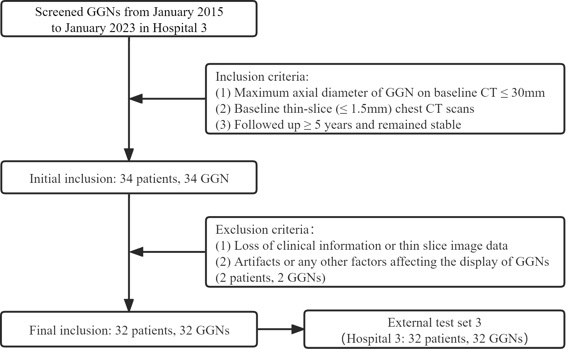Finally, 385 GGNs (149 benign and 236 malignant) of 385 patients were included (Figure 1). To maximize the training effect, we divided the data of Hospital 1 (239 patients, 239 GGNs) into a training set and an internal validation set at a ratio of 6:4 according to the composition of benign and malignant GGNs. Two independent external test sets were from Hospital 2 (115 patients, 115 GGNs) and Hospital 3 (31 patients, 31 GGNs). In addition, to further verify our model’s generalization, we screened 32 GGNs from Hospital 3 that were followed up over five years and still stable from January 2015 to January 2023 to form an independent external test set 3 (Figure 2). None of the GGNs in the external test set 3 had been pathologically confirmed to be benign or malignant, and given their prolonged stable state, they were treated as benign GGNs for analysis. The ethics committee of Hospital 2 approved the study, and the patient’s informed consent was waived because of the study’s retrospective nature.