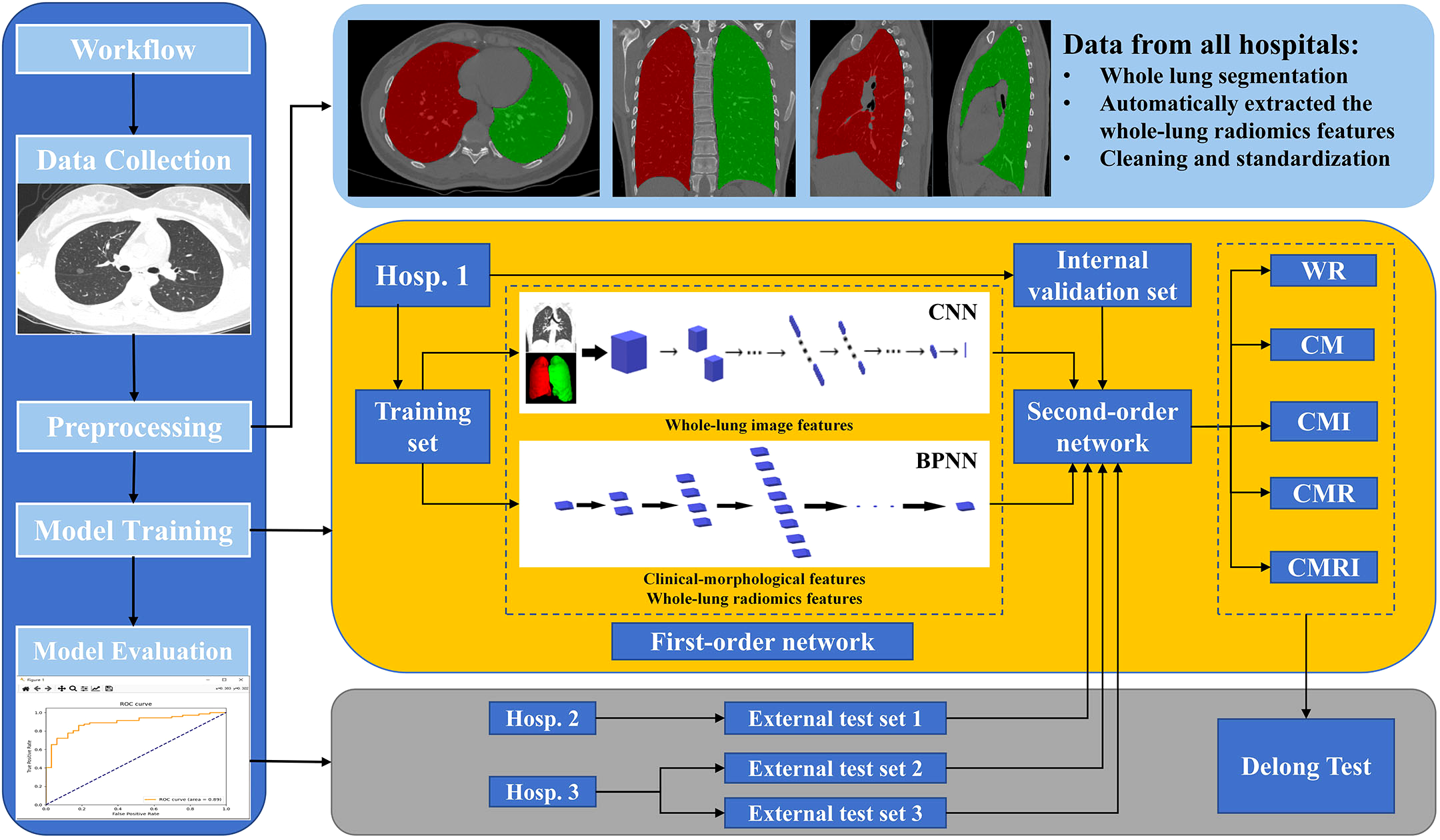 The overall workflow of this study The white square of CNN is the first-order neural network based on the whole-lung image features; the white block of BPNN is the first-order neural network based on clinical-morphological features and whole-lung radiomics features. CNN: convolutional neural network, BPNN: back-propagation neural network, CM: the model based on clinical-morphological features, CMR: the model combined clinical-morphological features and whole-lung radiomics features, CMI: the model combined clinical-morphological features and whole-lung image features, CMRI: the model integrated clinical-morphological features, whole-lung radiomics features, and whole-lung image features, WR: the model based on whole-lung radiomics features.