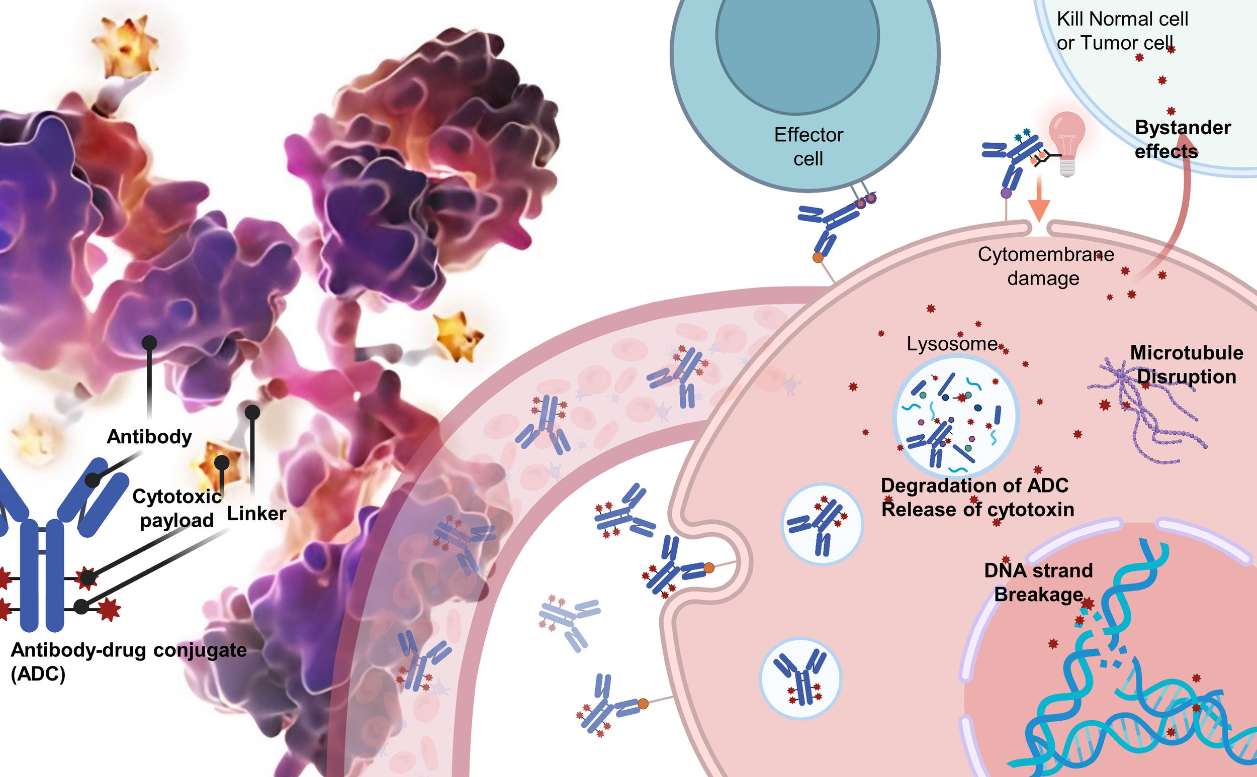 ADCs are composed of three integral components: a monoclonal antibody that selectively targets tumor antigens, a cytotoxic payload designed to disrupt DNA or tubulin within the targeted cancer cells, and a linker that covalently attaches the antibody to the payload. The efficacy of ADCs depends on the specificity and affinity of the antibody, the potency of the payload, and the stability of the linker in circulation, as well as its rapid release within the targeted cells (Figure 1).