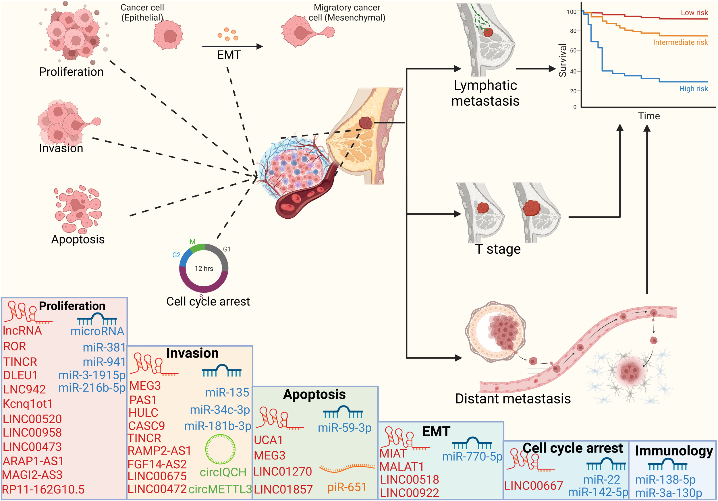 Figure 3 Cellular processes and prognosis regulated by ncRNAs ncRNAs can regulate cell proliferation, apoptosis, invasion and cell cycle, thereby affecting the tumor volume, lymph node metastasis and distant organ metastasis of breast cancer patients, and ultimately affecting the survival cycle of patients.