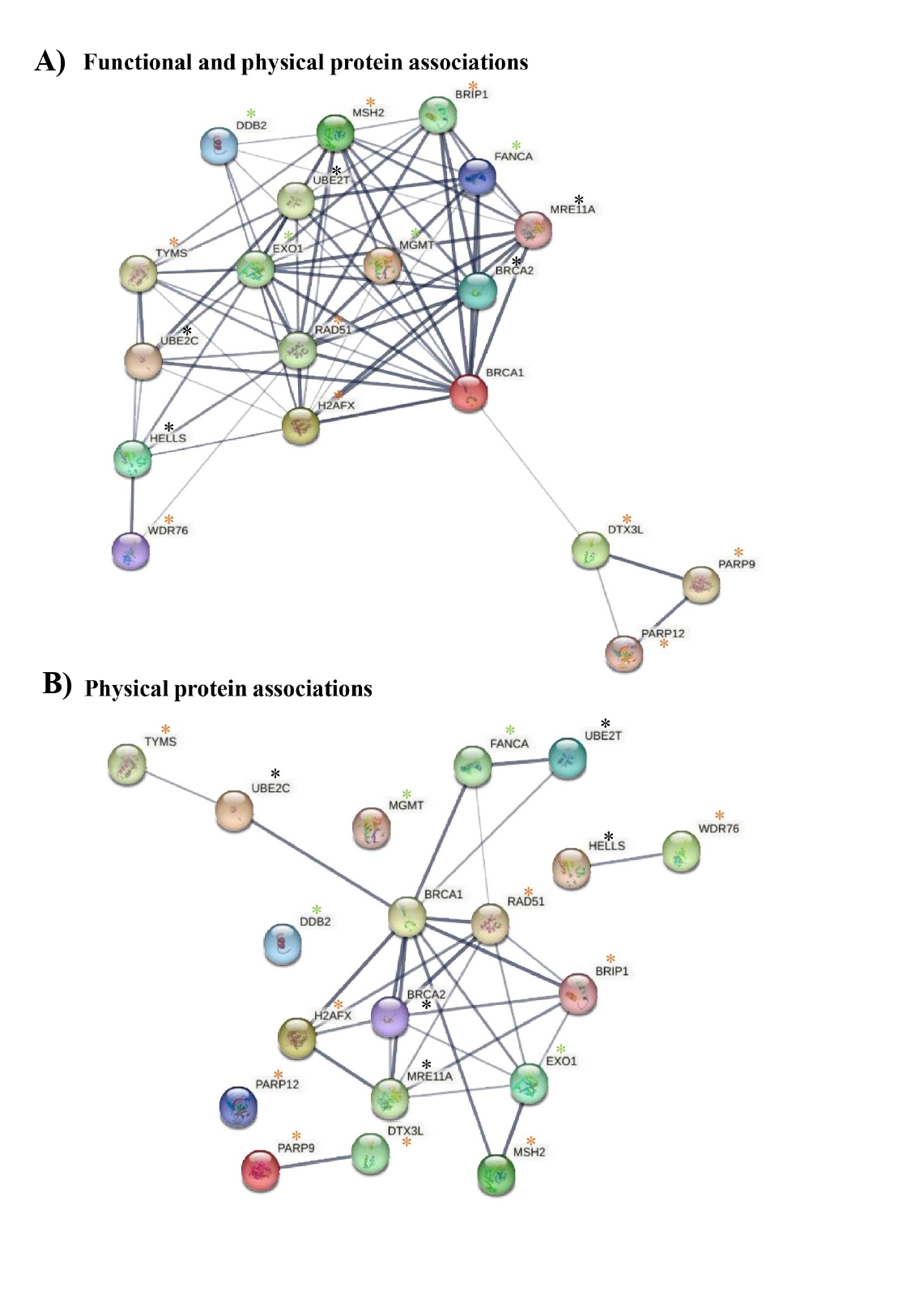Supplementary Figure 1 | Protein–protein networks of significantly down/up-regulated genes in BRCA-defective EOCs by using STRING database. Network nodes represent proteins: splice isoforms or post-translational modifications are collapsed, i.e. each node represents all the proteins produced by a single, protein-coding gene locus. (A) Edges represent protein-protein associations: associations are meant to be specific and meaningful, i.e. proteins jointly contribute to a shared function; this does not necessarily mean they are physically binding to each other. (B) Edges represent shared physical complex: the edges indicate that the directly linked proteins are part of the same physical complex; commonly in large complexes this may not signify they are directly binding to each other. Legend: black asterisks indicate differential expressed (DE) genes for both BRCA1mut and BRCA1met EOCs; orange asterisks indicate DE genes in only BRCA1mut EOCs; green asterisks indicate DE genes in only BRCAmet EOCs. Edges thickness indicates the level of confidence of the interaction: lighter line indicates high confidence rate (STRING score 0.700); darker line indicates highest confidence rate (STRING score 0.900).