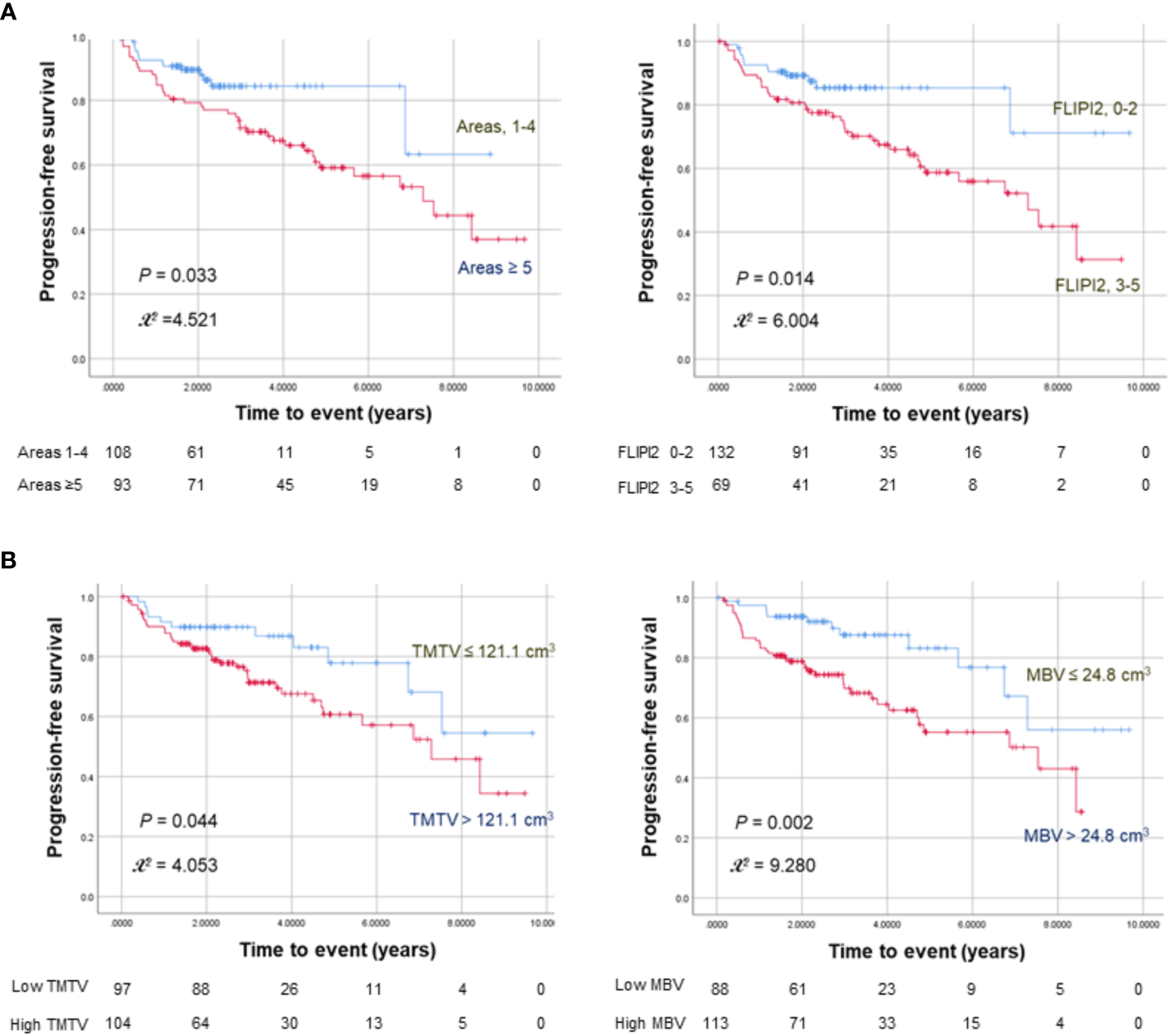 Kaplan–Meier curves for progression-free survival in 201 FL patients stratified by nodal lesion number or FLIPI2 risk score (A) and TMTV or MBV (B). The numbers at risk for each group are shown as a table under the curves.