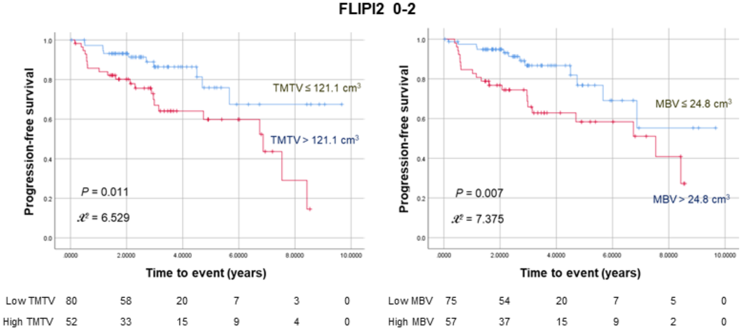 Kaplan–Meier curves for progression-free survival in 132 patients with low to intermediate FLIPI2 risk scores (0–2) stratified according to TMTV (left) or MBV (right). The numbers at risk for each group are shown as a table under the curves.