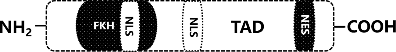 Forkhead box proteins constitute a group of evolutionarily conserved proteins with a DNA-binding domain consisting of three α-helices and two winged helical folds. Since different subtypes of FOX proteins show diverse binding specificities and cellular effects, the FOX family can be grouped into four different subfamilies, FOXM, FOXK, FOXA, and FOXO, on the basis of additional structural domains and conserved sequences. The FOXO family is involved in various cellular processes, such as apoptosis, oxidative stress, and cell cycle progression (6), with FOXO1, FOXO3a, FOXO4 and FOXO3a being more extensive; among these proteins, FOXO3a has been described in the most detail in the literature. FOXO3a, encoded by a gene located on human chromosome 6q21, is approximately 72 kDa in size and consists of 673 amino acid residues (7). It carries a highly conserved transcription element, and five structural domains (Figure 1): two nuclear localization signals (NLSs) and a nuclear export signal (NES) distant from the NLSs, contributing to the bidirectional movement of FOXO3a between the nucleus and the cytoplasm; a trans-activating structural domain (TAD) close to the carboxyl terminus, which allows direct and indirect activation of FOXO3a target gene expression; and a highly conserved forkhead DNA-binding domain (FKH), which the site of interaction with a candidate gene (8).