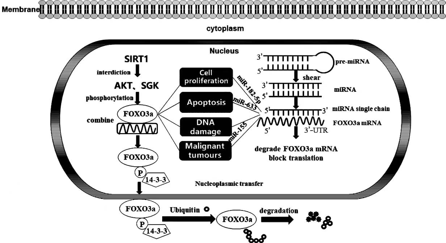 In general, FOXO3a exerts an influence in the nucleus to induce the transcription of target genes; simultaneously, it may respond to extracellular stimuli, such as drugs and UV radiation. Phosphokinase AKT and glucocorticoid-inducible kinase SGK prompt FOXO3a phosphorylation, which then binds to 14-3-3 protein, blocking access to an NLS in FOXO3a, driving its localization to the cytoplasm. Ultimately, FOXO3a is ubiquitinated and degraded in the cytoplasm in a proteasome-dependent manner, and deacetylation of the silencing regulatory protein SIRT1 diminishes FOXO3a phosphorylation and degradation, enabling FOXO3a to bind stably to target gene DNA. With the continuous advancement in genomics techniques, microRNAs have been shown to be steadily expressed in tumour tissues and to regulate the expression levels of genes by interacting with the 3’-untranslated region (3’-UTR) of an mRNA, decreasing its susceptibility to degradation and ultimately facilitating the negative regulation of mRNA levels to modify protein content (9). Notably, microRNAs might regulate the origin and progression of multiple conditions, including cancer, by targeting the mRNA of FOXO3a (Figure 2). In addition, our group previously showed that FOXO3a expression induces autophagy and apoptosis in breast cancer cells. Moreover, apoptosis is tightly connected with malignant tumour evolution, and the potential effect of a strategy to moderate FOXO3a activity through an anti-microRNA mechanism that promotes apoptosis is being increasingly recognized. Posttranscriptional therapy mediated by specifically targeting microRNAs facilitates the critical role played by individualized medicine. Nevertheless, the interaction between a microRNA and FOXO3a is not limited to apoptosis induction; therefore, elucidating the mechanism underlying tumorigenesis at the molecular level is of profound importance for the diagnosis and precise treatment of disorders.