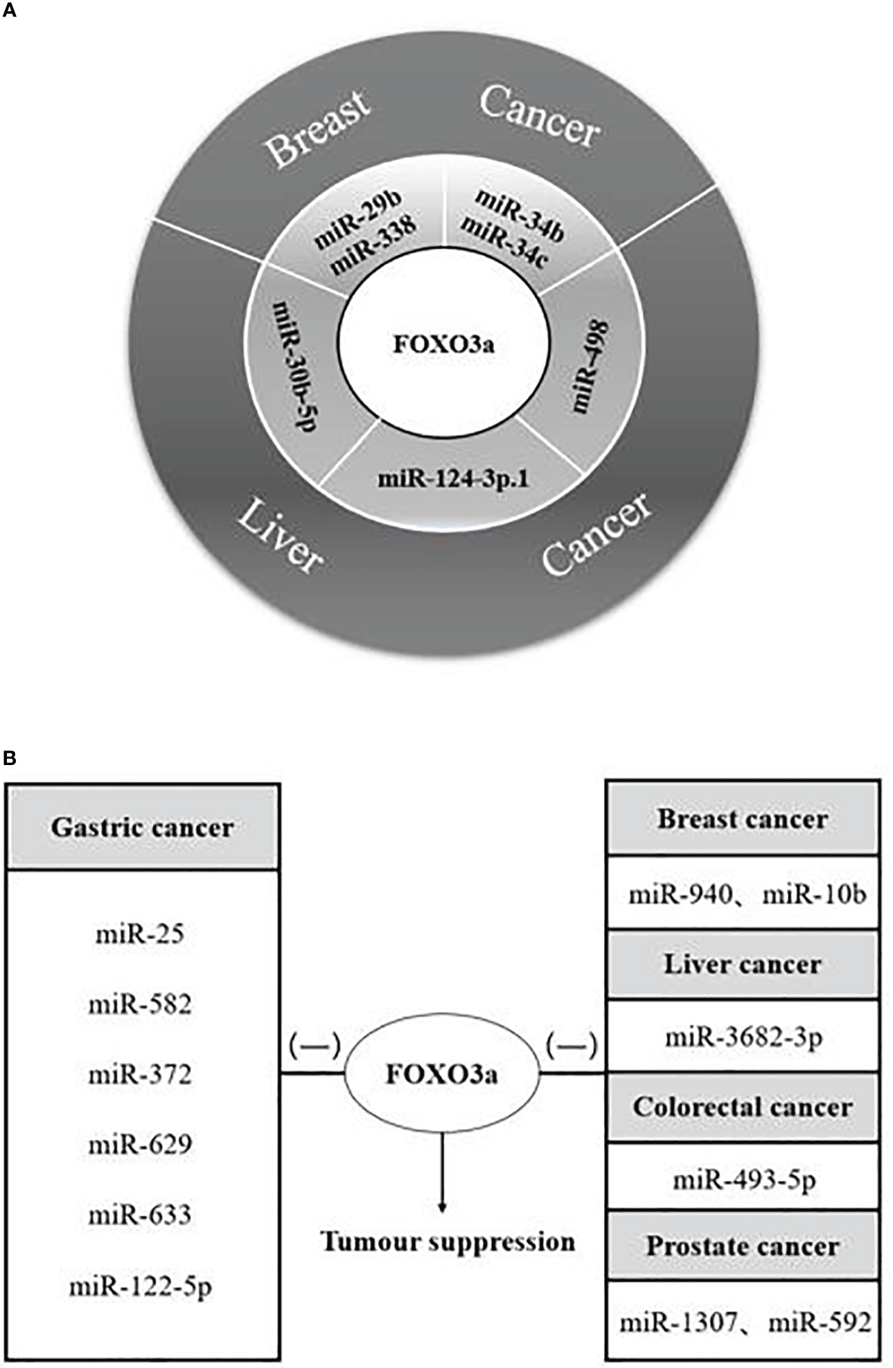 MicroRNAs synergize/antagonize FOXO3a to regulate tumour progression. (A) MicroRNAs synergize with FOXO3a to inhibit breast and liver cancer progression; Both microRNAs and FOXO3a are tumour suppressors. (B) MicroRNAs antagonism of FOXO3a to promote carcinogenesis. (-) represents antagonism with FOXO3a; FOXO3a possesses tumour suppressor function; MicroRNAs promote tumour proliferation.
