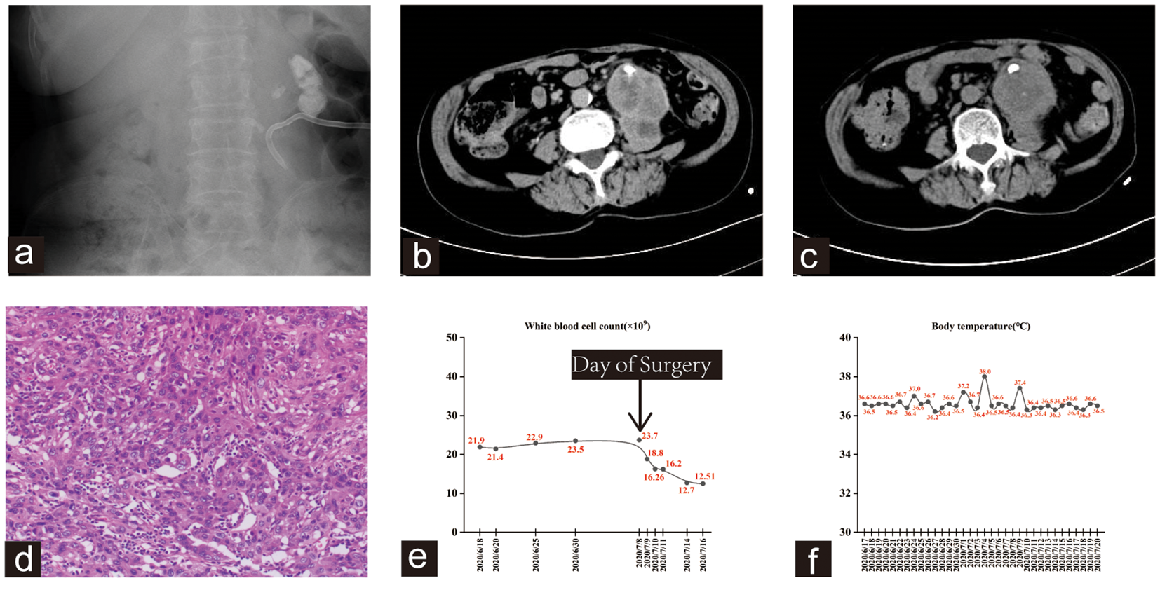 Figure 2 (A) kub showed multiple stones in the left kidney and ureter. A left renal drainage tube was seen. (B, C) The CTU scan showed an unclear boundary between the left kidney and the adjacent psoas major muscle, with both structures displaying uneven enhancement. Additionally, there was evidence of malrotation in the right kidney. (D) The hematoxylin and eosin staining revealed high-grade invasive urothelial carcinoma with extensive necrosis and focal sarcomatoid differentiation. (E, F) Trends in WBC count and body temperature of the patient.