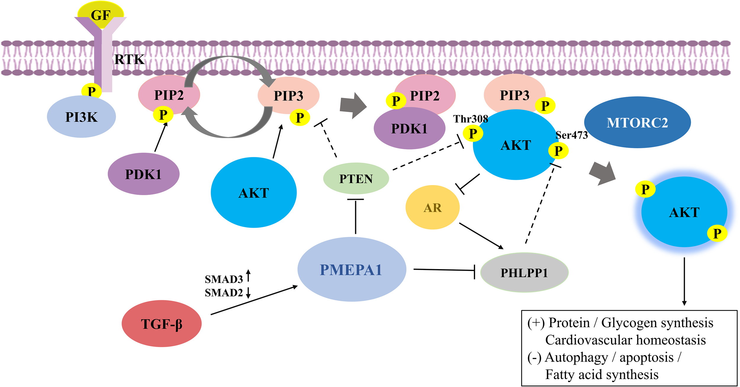 The mechanisms and the crosstalk of increased PI3K/AKT signaling by prostate transmembrane androgen-inducible protein 1 (PMEPA1). RTK binds to extracellular ligands that recruit PI3K to anchored receptors at the plasma membrane to activate PI3K signaling. PI3K phosphorylates PIP2 to PIP3, where the latter can be dephosphorylated to PIP2 in the presence of PTEN. PIP3 then binds to downstream effectors, including PDK1 and AKT, and recruits them to the membrane. PDK1 and mTORC2 phosphorylate AKT at the activation loop (Thr308) and hydrophobic group (Ser473), respectively, to completely activate AKT. PI3K/AKT signaling is also tightly regulated by negative regulatory molecules. PTEN suppresses PI3K/AKT signaling by inhibiting AKT activation and converting PIP3 to PIP2. Additionally, PHLPP1 dephosphorylates AKT at Ser473, leading to blocked AKT signaling. PMEPA1 promotes expression of the PI3K/AKT signaling pathway by increasing PTEN turnover and attenuating PTEN expression and mediates downregulation of PHLPP1 via the PY motif. AKT is cross-regulated with TGF-β and AR signaling in several mutually inhibitory loops. Further, TGF-β exerts a regulatory influence on PMEPA1 by modulating the ratio of Smad proteins. AKT phosphorylates AR at Ser-210 and inhibits the transcriptional activation of AR. Conversely, AR promotes PHLPP1 expression to stimulate AKT signaling. PI3K/AKT, phosphatidylinositol 3-kinase/protein kinase B; PMEPA1, prostate transmembrane androgen-inducible protein 1; RTK, Receptor tyrosine kinase; PIP3, phosphatidylinositol-3,4,5-trisphosphate; PIP2, phosphatidylinositol-4,5-bisphosphate; PDK, phosphatidylinositol-dependent kinase; mTORC2, mammalian rapamycin complex 2; PTEN, phosphatase and tensin homolog; PHLPP1, pleckstrin homology domain leucine-rich repeat protein phosphatase 1; TGF-β, transforming growth factor-β; AR, androgen receptor.