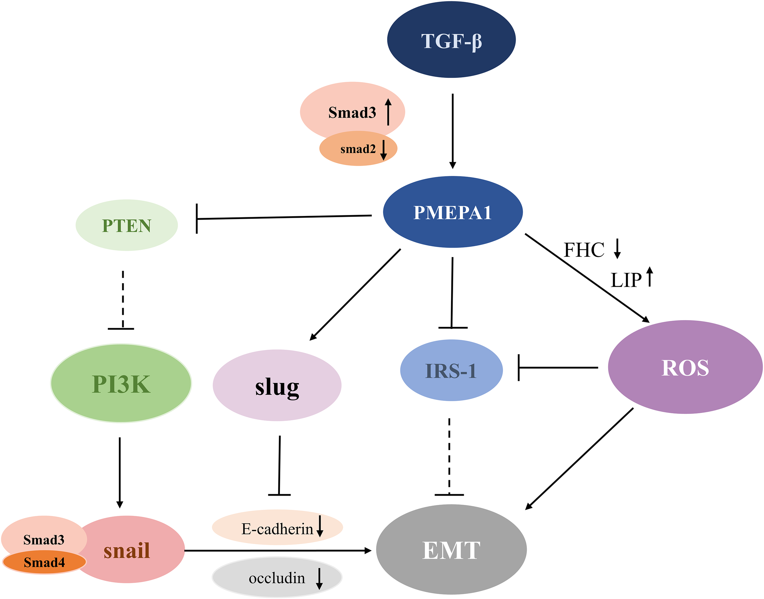 Schematic diagram of the PMEPA1-mediated EMT pathway. TGF-β stimulates the expression of PMEPA1, which directly down-regulates the levels of IRS-1 and FHC. This further promotes LIP conduction and leads to increased ROS production and EMT. Additionally, PMEPA1 promotes the production of Slug, which binds to the E-box region to inhibit the expression of E-cadherin and augment EMT formation. Increased expression of Smad3 or reduced expression of Smad2 upregulates the level of PMEPA1, which increases PTEN degradation of PTEN, and diminishes its suppressive effect on the PI3K signaling pathway. The activated PI3K signaling pathway induces EMT by downregulation of E-cadherin and occludin through a Snai1/Smad3/Smad4 complex. TGF-β, transforming growth factor-β; PMEPA1, prostate transmembrane androgen-inducible protein 1; IRS-1, insulin receptor substrate-1; ROS, reactive oxygen species; PTEN, phosphatase and tensin homolog; PI3K, phosphatidylinositol 3-kinase; EMT, epithelial-mesenchymal transition; FHC, ferritin heavy chain; LIP, labile iron pool.