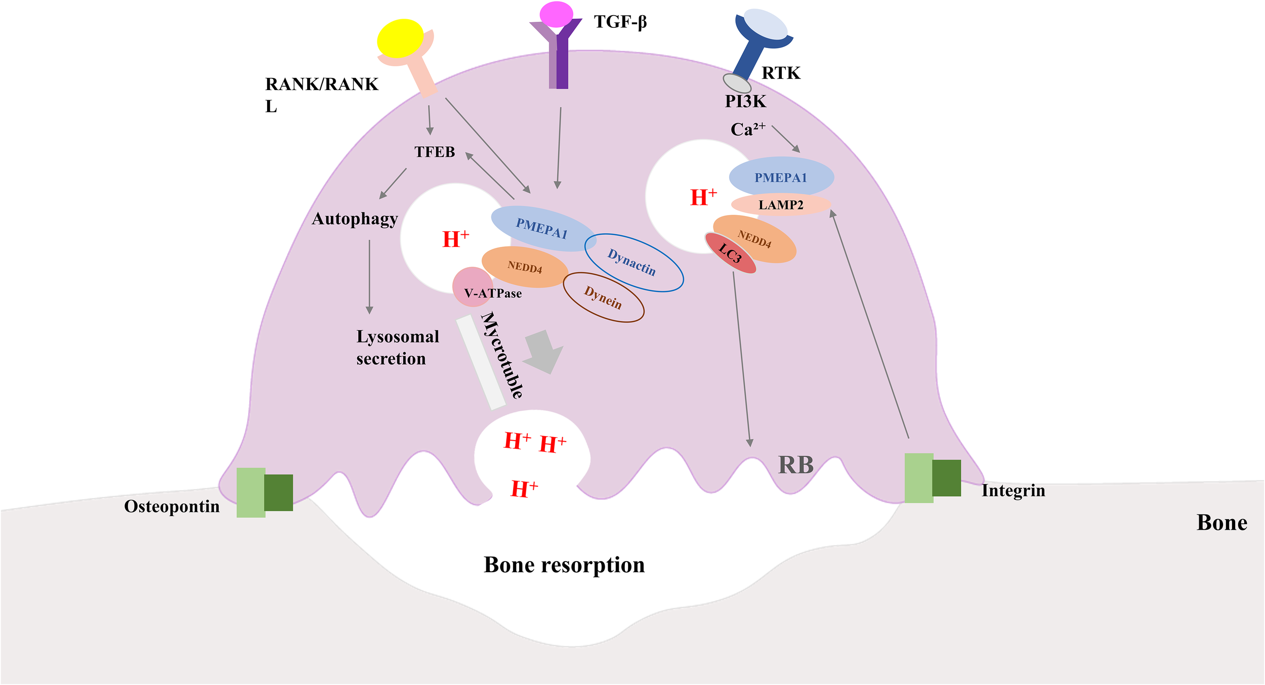 Diagram of how osteoclasts work along with the role of PMEPA1. Interaction of integrins and bone matrix leads to attachment of osteoclasts to bone, further inducing polarization of osteoclasts. RANK/RANKL signaling and PMEPA1 activate TFEB, which promotes autophagy and increases lysosomal secretion. PMEPA1 levels are increased by the PI3K signaling pathway and intracellular Ca2+, and the release of TGF-β and bone-bridging proteins from osteoclasts further increases the expression of PMEPA. PMEPA1 locates at LAMP-2, partially co-localizes with LC3 lysosomes, NEDD4 and V-ATPase components (V0A3, V0D2 and V1B2 subunits). PMEPA1 and NEDD4 interact with dynactin and dynein, respectively, and facilitate lysosomal movement along microtubules toward the plasma membrane to secrete protons. PMEPA1 also promotes bone resorption by regulating the formation of actin rings through LC3. RANK/RANKL, receptor activator of nuclear factor-kB/RANK Ligand; TGF-β, transforming growth factor-β; PI3K, phosphatidylinositol 3-kinase; PMEPA1, prostate transmembrane androgen-inducible protein 1; LC3, light chain 3; NEDD4, the neuronally expressed developmentally downregulated 4; TFEB, transcription factor EB; LAMP -2, lysosomal-associated membrane protein 2.