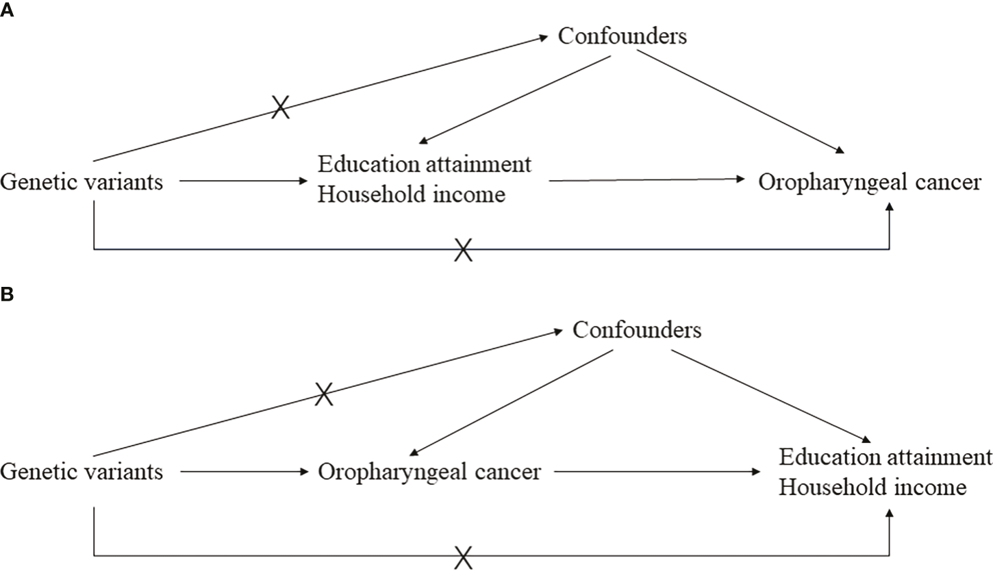 Mendelian randomization (MR) is an emerging epidemiological method for causal inference, using genetic variants as instrumental variables (IV), and has made a substantial contribution to identifying or ruling out risk factors for specified diseases (10). Thanks to the rapid development of genome-wide association studies (GWAS), MR studies have become much more flexible in the two-sample setting (11). A recent MR study, including both univariable and multivariable methods, corroborated the hazardous effect of smoking and alcohol consumption on oropharyngeal cancer (12). Another MR ruled out the causal relationship between 25-hydroxyvitamin D and the risk of oropharyngeal cancer (13). Education has been reported to be associated with oropharyngeal cancer (14, 15), together with income (16). Usually, those with a higher education degree and a higher income are less likely to catch oropharyngeal cancer. These results might be confounded by occupations and other factors (2); however, no study answered the question of whether educational attainment and income are causally associated with oropharyngeal cancer. Traditional observational studies can suffer from unadjusted confounders and reverse causation. Our MR analysis used genetic variants to estimate the causal relationship between educational attainment, household income, and oropharyngeal cancer using a causal inference framework, which should be a suitable method to give causal inference when randomized clinical trials (RCTs) are unavailable and impractical (17).