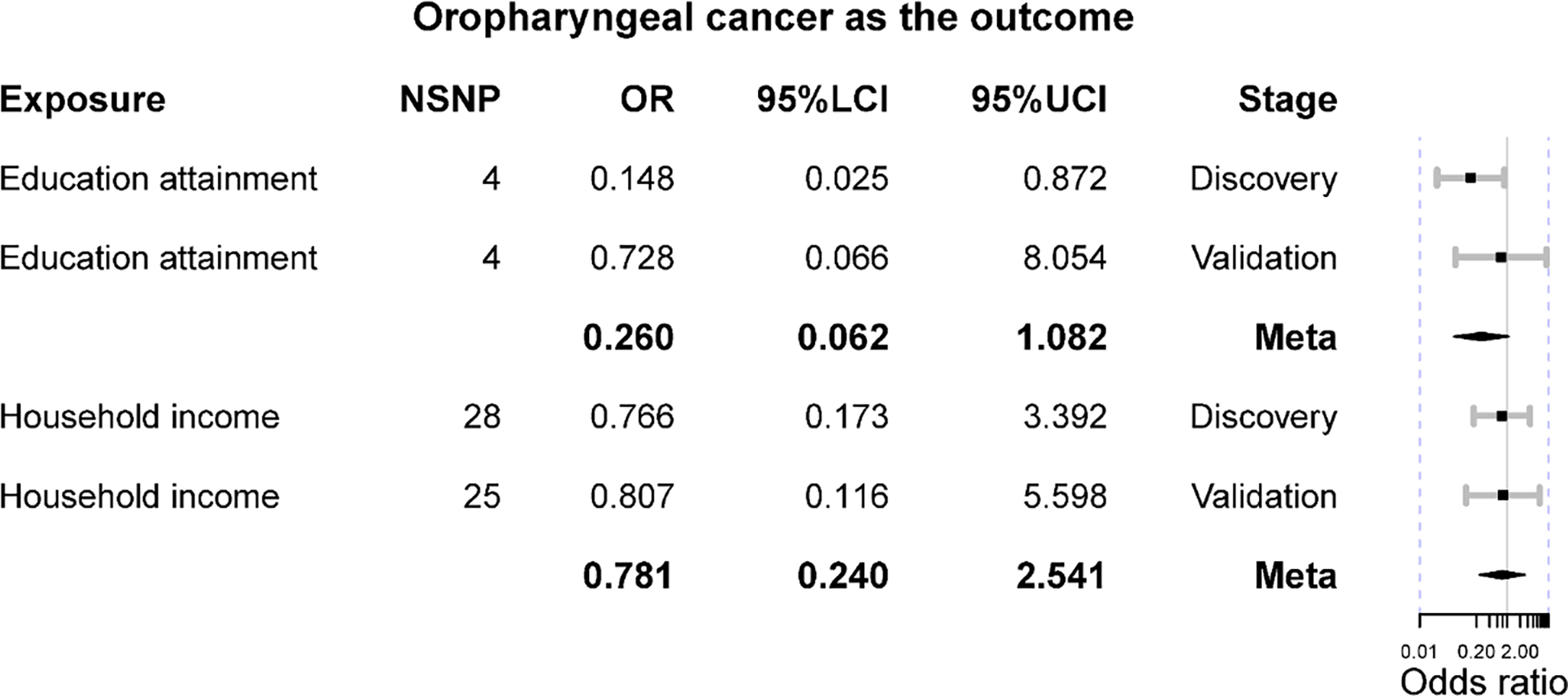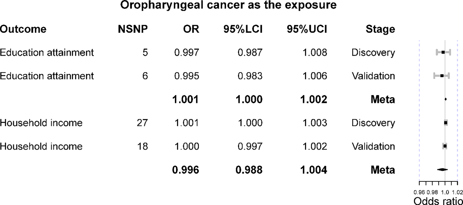 | Oropharyngeal cancer | Household income | Discovery | 1.002 | 0.998 | 1.005 | 0.386 | 1.002 | 1.000 | 1.004 | 0.049 | 0.261 | 0.943 |