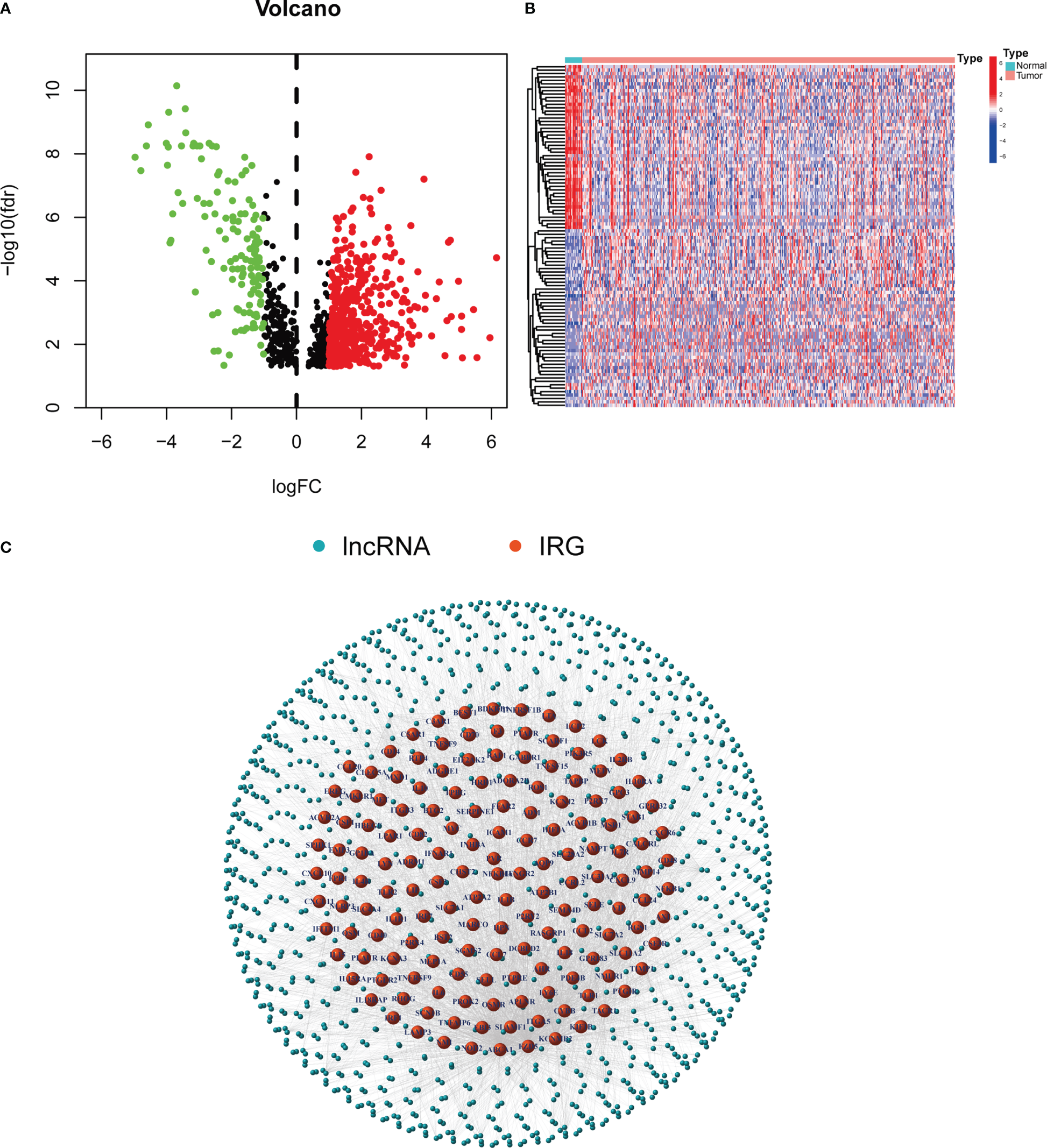 Inflammation-related lncRNAs in BLCA patients. (A) Volcano plot of 642 differentially expressed lncRNAs. (B) Heatmap of the expression of 642 inflammation-related lnRNAs in normal samples and tumor samples. (C) Network between 200 inflammation-related genes and 642 lncRNAs.