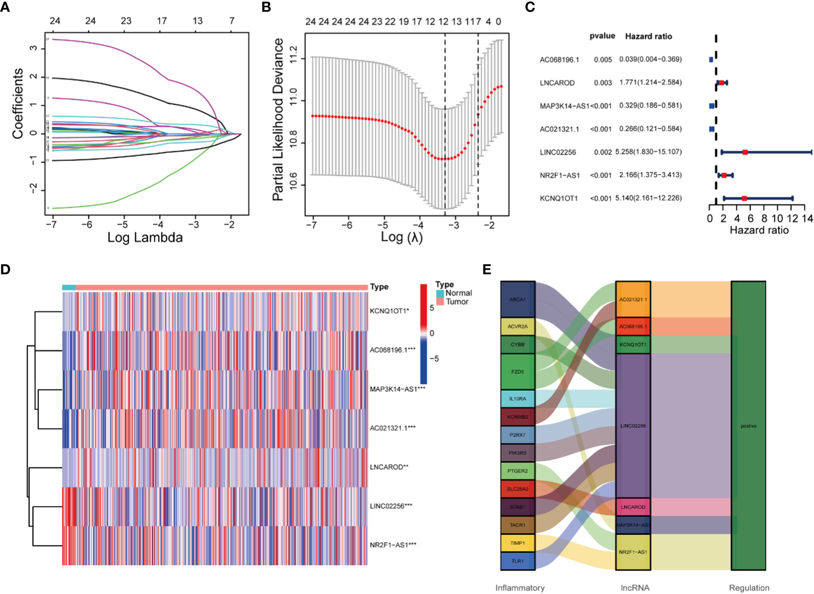 Construction of the 7 inflammation-related lncRNAs model.Cox regression analysis of inflammation-related lncRNAs in BLCA. (A) 10-fold cross-validation in the LASSO analysis. (B) LASSO coefficient profile of the 7 inflammation-related lncRNAs. (C) Univariate Cox regression analysis. (D) Heatmap of the expression profiles of 7 lncRNAs. (E) The Sankey diagram of inflammation genes and lncRNAs.