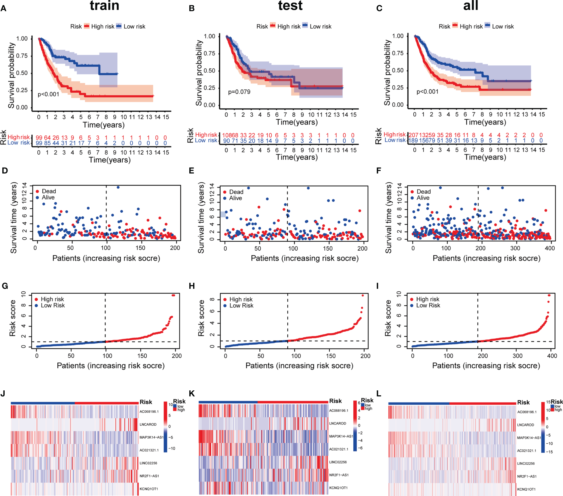 Prognosis value of the 7 inflammation-related lncRNAs model in the train, test, and entire sets. (A–C) Kaplan–Meier survival curves of patients in the train, test, and entire datasets, respectively. (D-F) Survival time and status in the train, test, and entire datasets, respectively. (G–I) Inflammation-related lncRNAs model based on risk scores of the train, test, and entire datasets, respectively. (J–L) Heatmaps of the expression of the 7 lncRNAs in the train, test, and entire sets, respectively.
