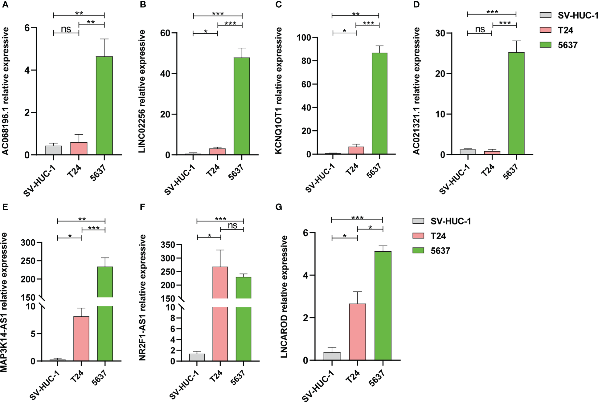 The mRNA expression levels of 7 lncRNAs in two bladder cancer cell lines by qRT-PCR. (A) AC068196.1; (B) LINC02256; (C) KCNQ1OT1; (D) AC021321.1; (E) MAP3K14-AS1; (F) NR2F1-AS1; (G) LNCAROD. *p < 0.05, **p < 0.01, and ***p < 0.001. ns, not statistically significant.