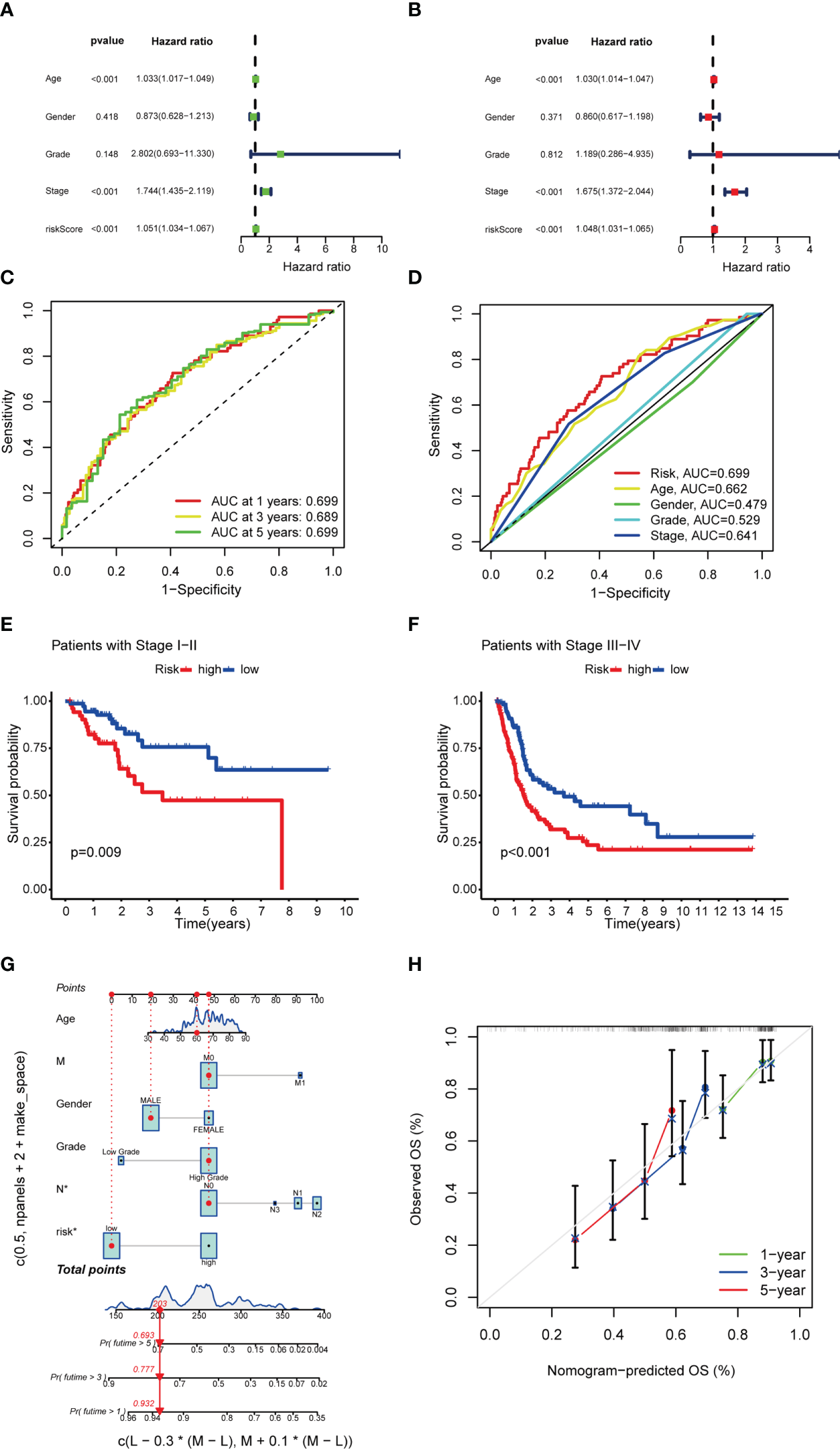 Univariate Cox and multivariate Cox regression analyses and nomogram construction. (A, B) Univariate Cox (A) and multivariate Cox (B) analyses of clinical factors and risk score for prediction of overall survival. (C, D) 1-, 3-, and 5-year ROC curves of risk score and clinical characteristics. (E, F) Kaplan–Meier survival curves of patients in the stage I-II and stage III-IV groups, respectively. (G) 1-, 3-, and 5-year overall survival predicted by the nomogram integrating risk score, age, and tumor staging. (H) Calibration curves for 1-, 3-, and 5-year overall survival.