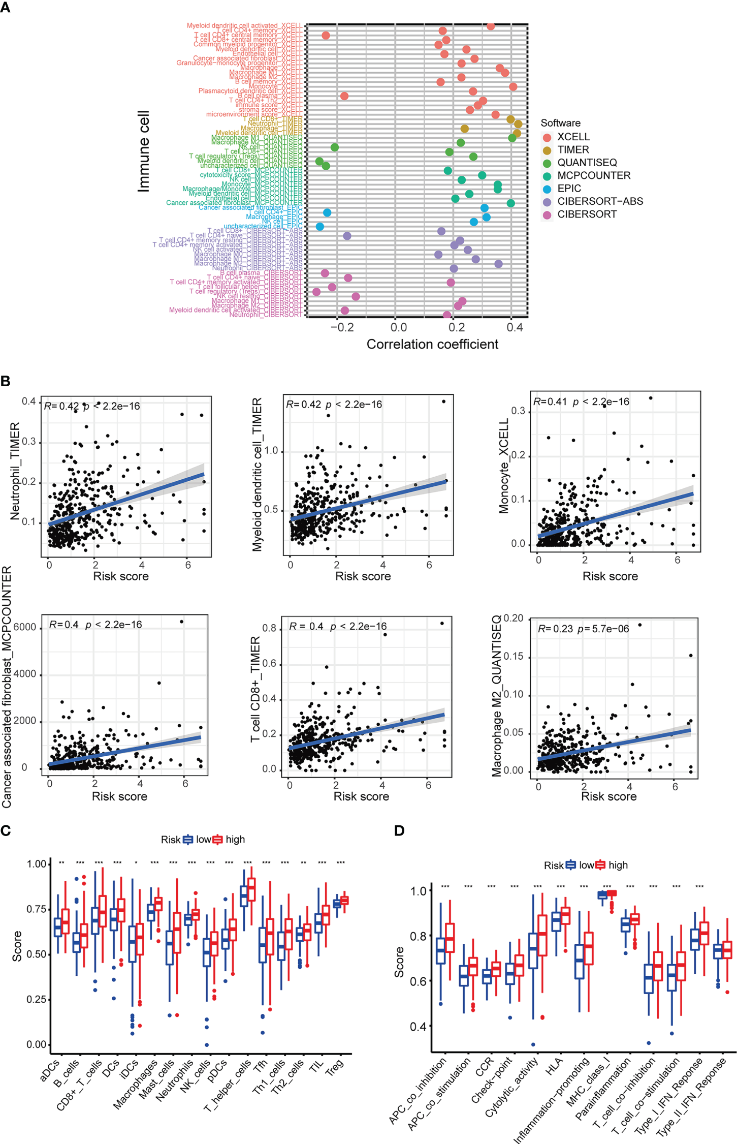 Investigation of tumor immune factors. (A) The immune cell bubble of risk groups. (B) The correlation between risk score and immune cells. (C, D) Relative frequency of immune cells and immunological activities assessed using ssGSE. *p < 0.05, **p < 0.01, and ***p < 0.001.