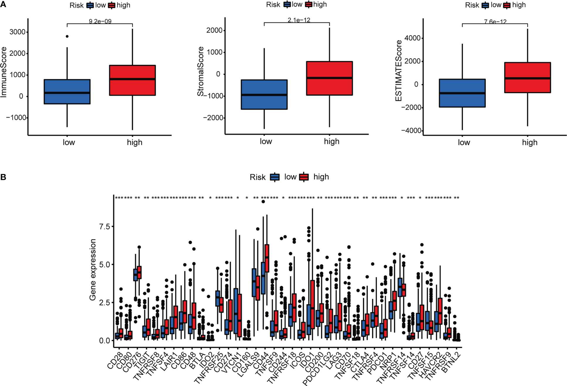 Investigation of tumor immunotherapy. (A) Comparison of immune scores between low-risk and high-risk groups. (B) Expression of 18 immune checkpoints in different risk groups. *p<0.05, **p<0.01, and ***p<0.001.