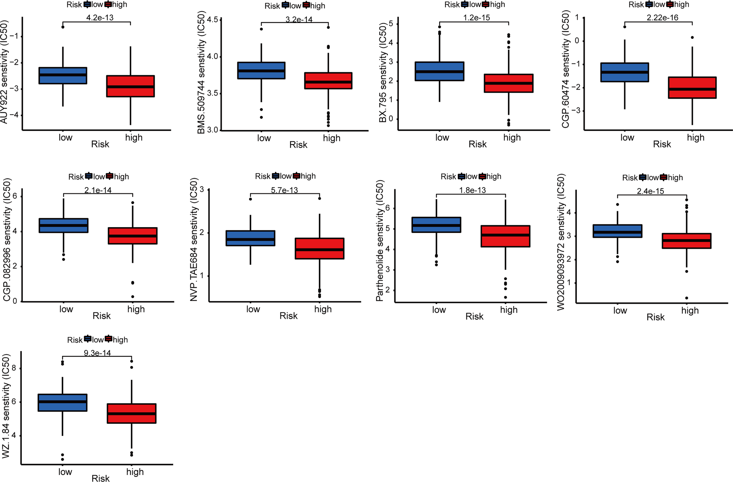 Immunotherapy response of risk groups. The IC50 values of 9 immunotherapeutic, chemical, or targeted agents used in the risk groups.