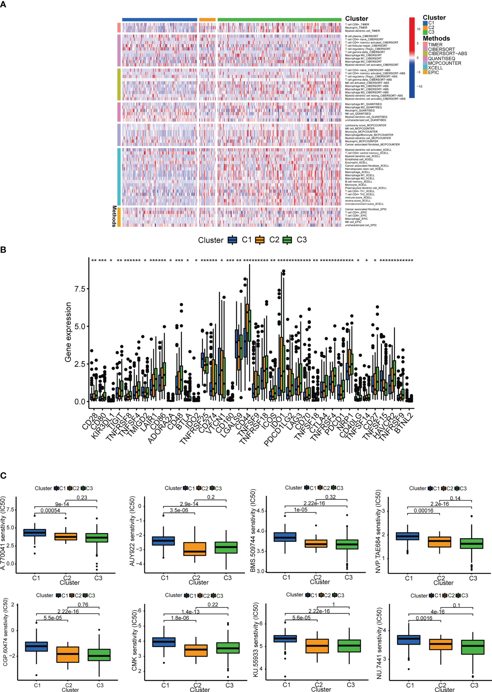 Prediction of immunotherapy efficacy. (A) Heatmap of immune cells in each cluster. (B) Differences in the expression of 18 immune checkpoints among the 3 clusters. (C) Immunotherapeutic agents that showed significantly different IC50 among the 3 clusters. *p<0.05, **p<0.01, and ***p<0.001.