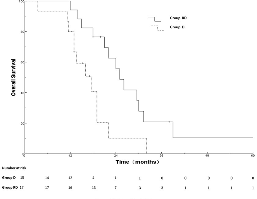 Out of 25 patients without radiotherapy, ten were deemed unsuitable for radiotherapy, including uncontrolled MPE (n=2), extensive progression except for MPE (n=8). Group of 17 patients with radiotherapy and 15 patients without radiotherapy was named RD and D group, respectively. There was no significant difference between the two groups with respect to gender, age, T stage, N stage, metastatic status (simple MPE vs. MPE with other metastases), involving organ (≤3 vs. >3) systemic chemotherapy and targeted therapy (Table 3). The PFS rates at 6, 12, 18 months for the RD group and D group were 76.5%, 17.6%, 5.9% and 73.3%, 26.7%, 0%, respectively; the corresponding median PFS were 10.0 months and 9.5 months, respectively (χ2 = 0.011, p =0.918) (Figure 2). The OS rates at 1, 2, 3 years for the RD group and D group were 88.2%, 50.5%, 21.7% and 80.0%, 20.3%, 0%, respectively; the corresponding median survival time (MST)were 26.1 months and 17.5 months, respectively (χ2 = 4.959, p =0.026) (Figure 3).