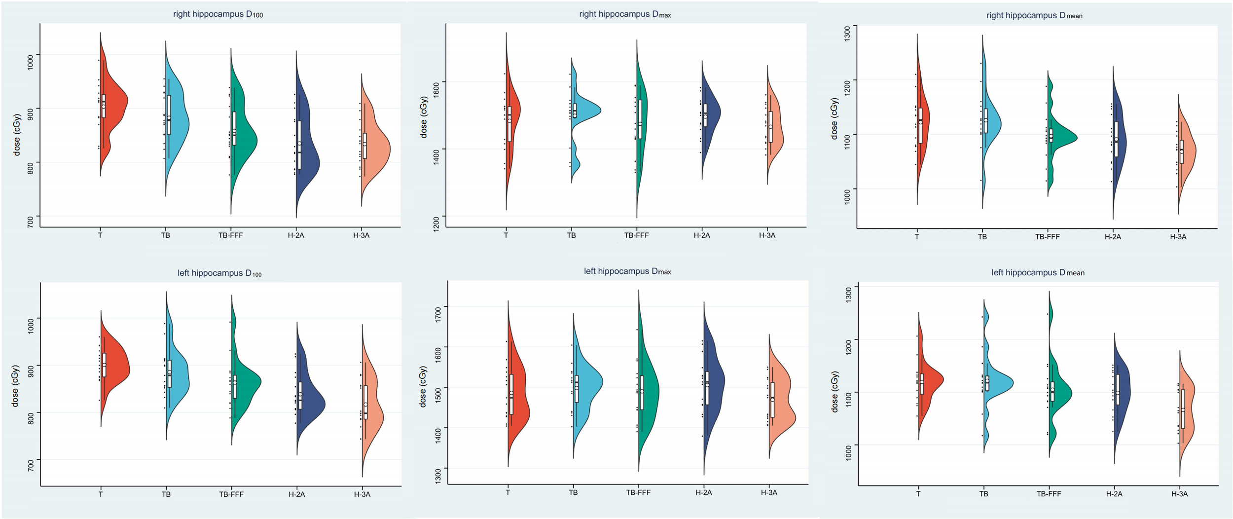For hippocampus, dose received by 100% volume (D100), the mean dose (Dmean), and the maximum dose (Dmax) were analyzed. For lenses, optic nerves, brainstem and spinal cord, the maximum doses (Dmax) were analyzed. For eyeballs, the mean dose (Dmean), and the maximum dose (Dmax) were analyzed.