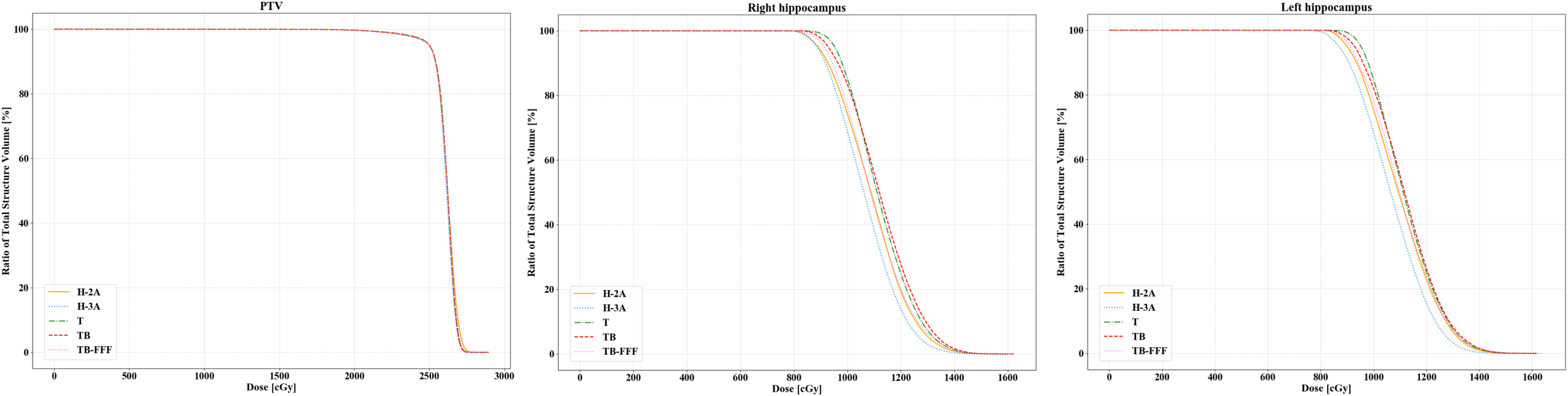 The average volume of PTV was 1683.0 ± 160.9 cm3. The average volume of left hippocampus was 2.88 ± 1.61 cm3. The average volume of right hippocampus was 2.81 ± 1.45 cm3.