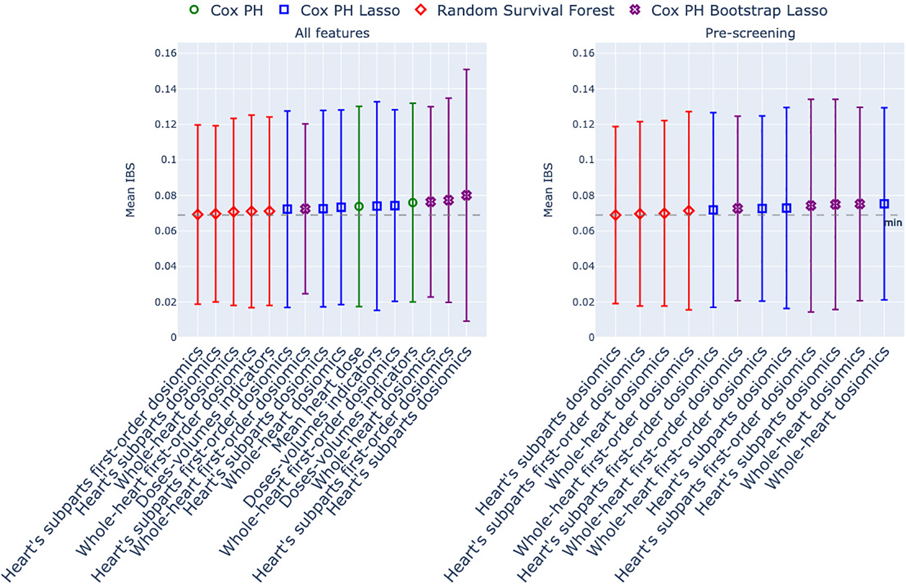 An RSF model adjusted on the first-order dosiomics predictors extracted from the whole heart performed best regarding the C-index (0.792 ± 0.049), and an RSF model adjusted on the first-order dosiomics predictors extracted from the heart’s subparts performed best regarding the IBS (0.069 ± 0.05). However, the difference is not statistically significant with the standard models (C-index of Cox PH adjusted on dose-volume indicators: 0.791 ± 0.044; IBS of Cox PH adjusted on the mean dose to the heart: 0.074 ± 0.056).