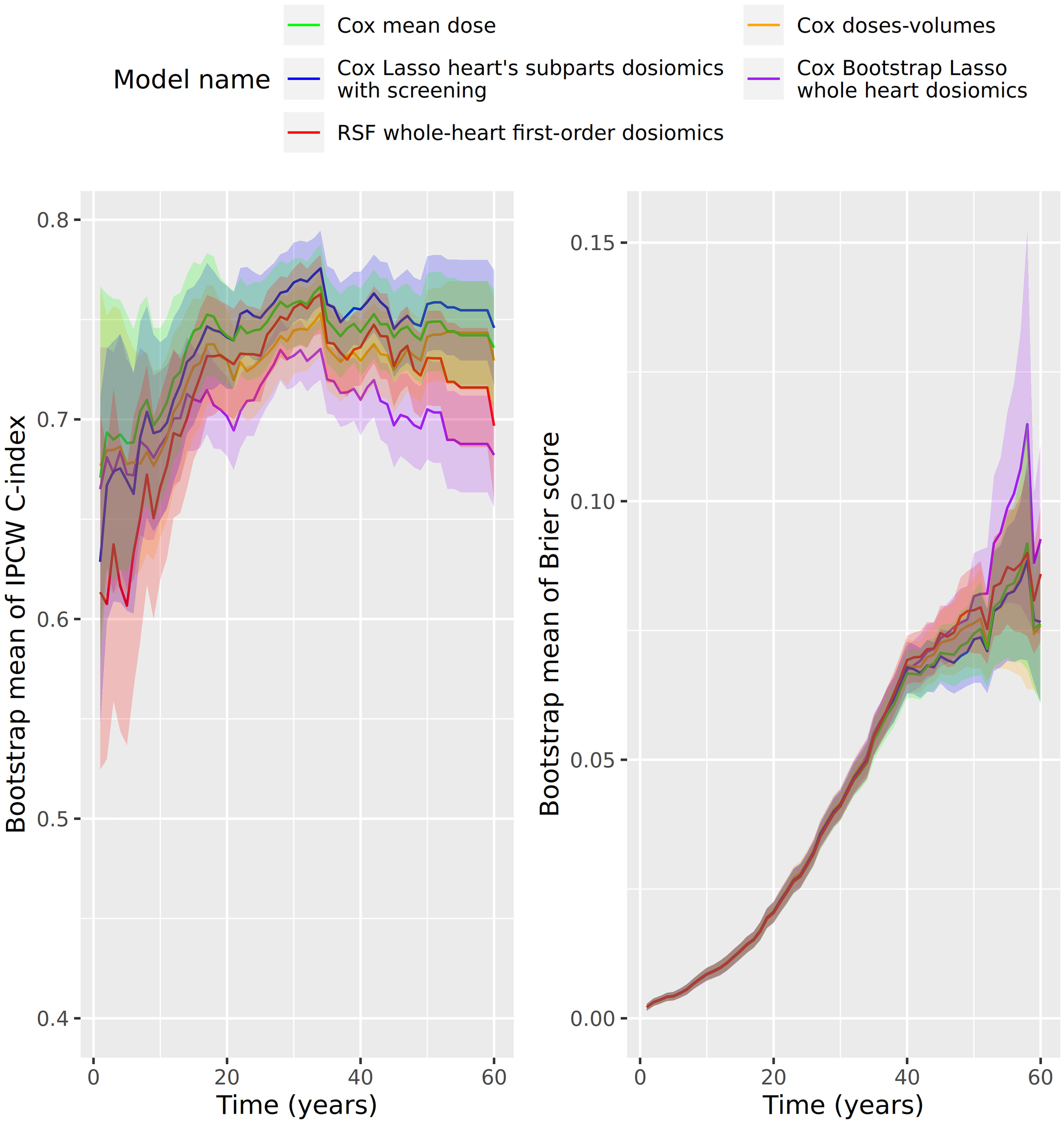 After the 5-fold cross-validation, we estimate more precisely the models’ error via time-dependent error curves. We draw 100 bootstraps. For each time years, we fit the models on the bootstrap, and we compute over the out-of-bag samples the Brier score BS (τ), and the bounded IPCW C-index Cτ (34), which correspond to the IPCW C-index whose events that occurred above τ are discarded. Due to the large number of models, we select one representative model among Cox Lasso, Cox Bootstrap Lasso, and RSF based on their performance on the 5-fold cross-validation. We also run this procedure for the standard models (Cox with mean heart dose, Cox doses-volumes, Cox Lasso doses-volumes). The hyper-parameters are those which performed the best in the 5-fold cross-validation.