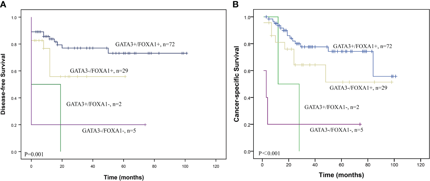 Results: GATA3 expression was positively correlated with FOXA1 (P=0.031). Absence of GATA3/FOXA1 co-expression (GATA3-/FOXA1-) was associated with tumor extensive necrosis (P=0.001) after Bonferroni correction for multiple comparisons. GATA3-/FOXA1- was associated with shorter Disease-Free Survival (DFS) (P=0.001) and Cancer-Specific Survival (CSS) (P<0.001) than other combination groups. Multivariate analyses identified extensive necrosis as an independent prognostic factor for CSS (P=0.030).