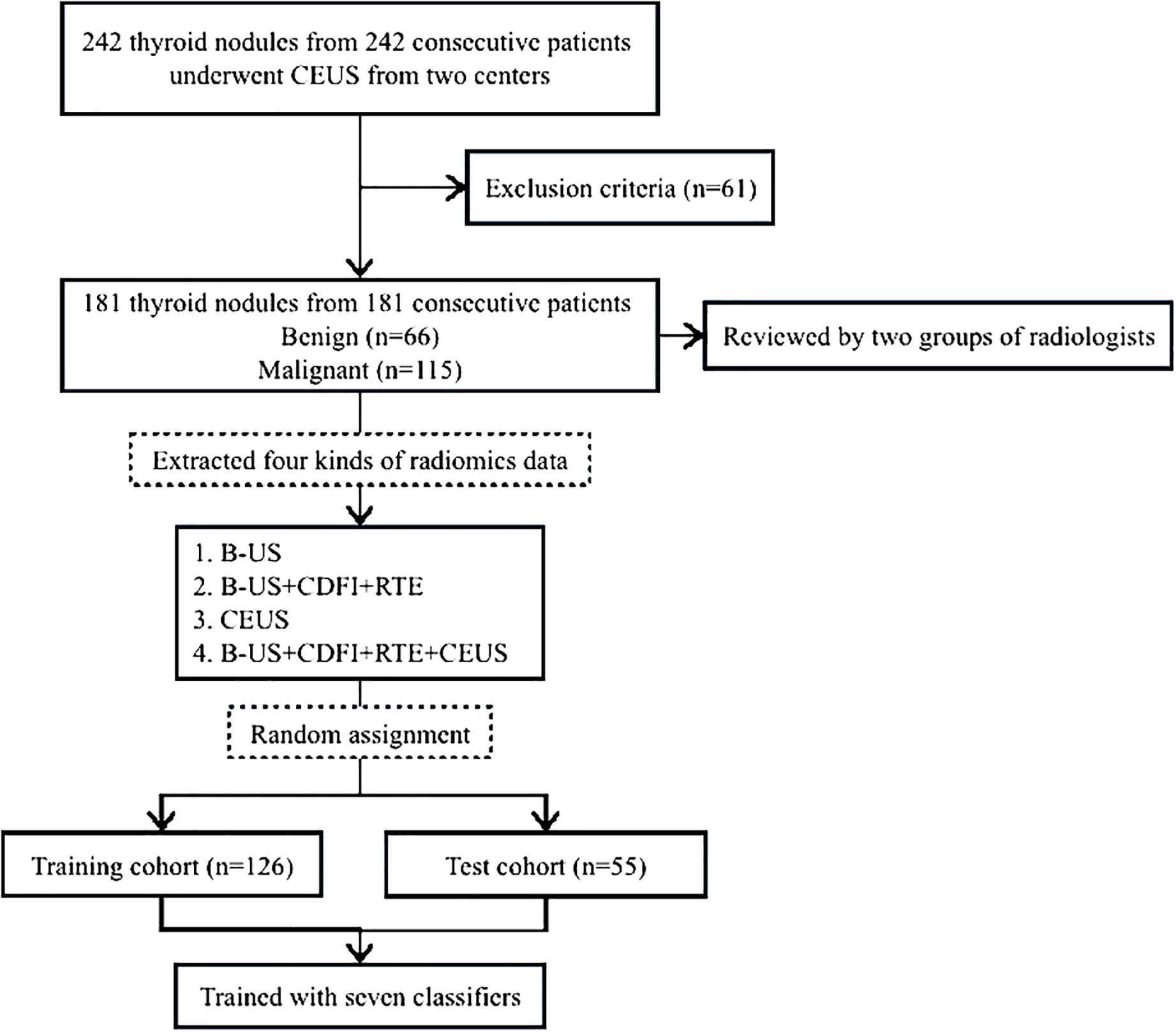 Therefore, the conventional ultrasound images and CEUS cines of thyroid nodules were analyzed, and different image combinations were used to build ML models in the present study to explore the clinical value of thyroid multimodal ultrasound, especially CEUS. In the meanwhile, radiologists were invited to perform the discriminative readings of conventional ultrasound images and CEUS videos. Additionally, a comparison of diagnostic performance was made between radiologists and algorithms, and among different ML models, to find a more accurate method of improving clinical diagnosis.