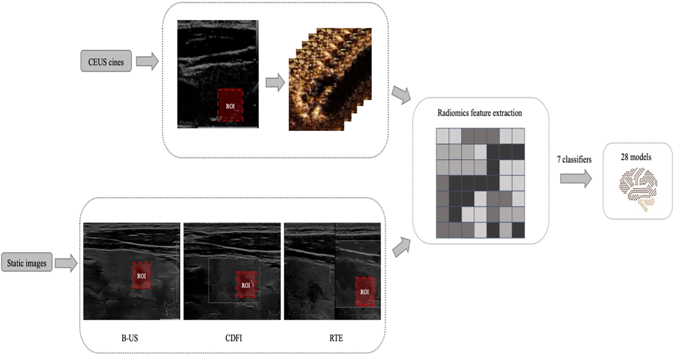 Example of delineating regions of interest (ROIs) on a contrast-enhanced ultrasound (CEUS) frame and 3 static images in B-mode ultrasound (B-US), real-time elastography (RTE), and color doppler flow images (CDFI) modes. And the design process of all machine learning (ML) models.