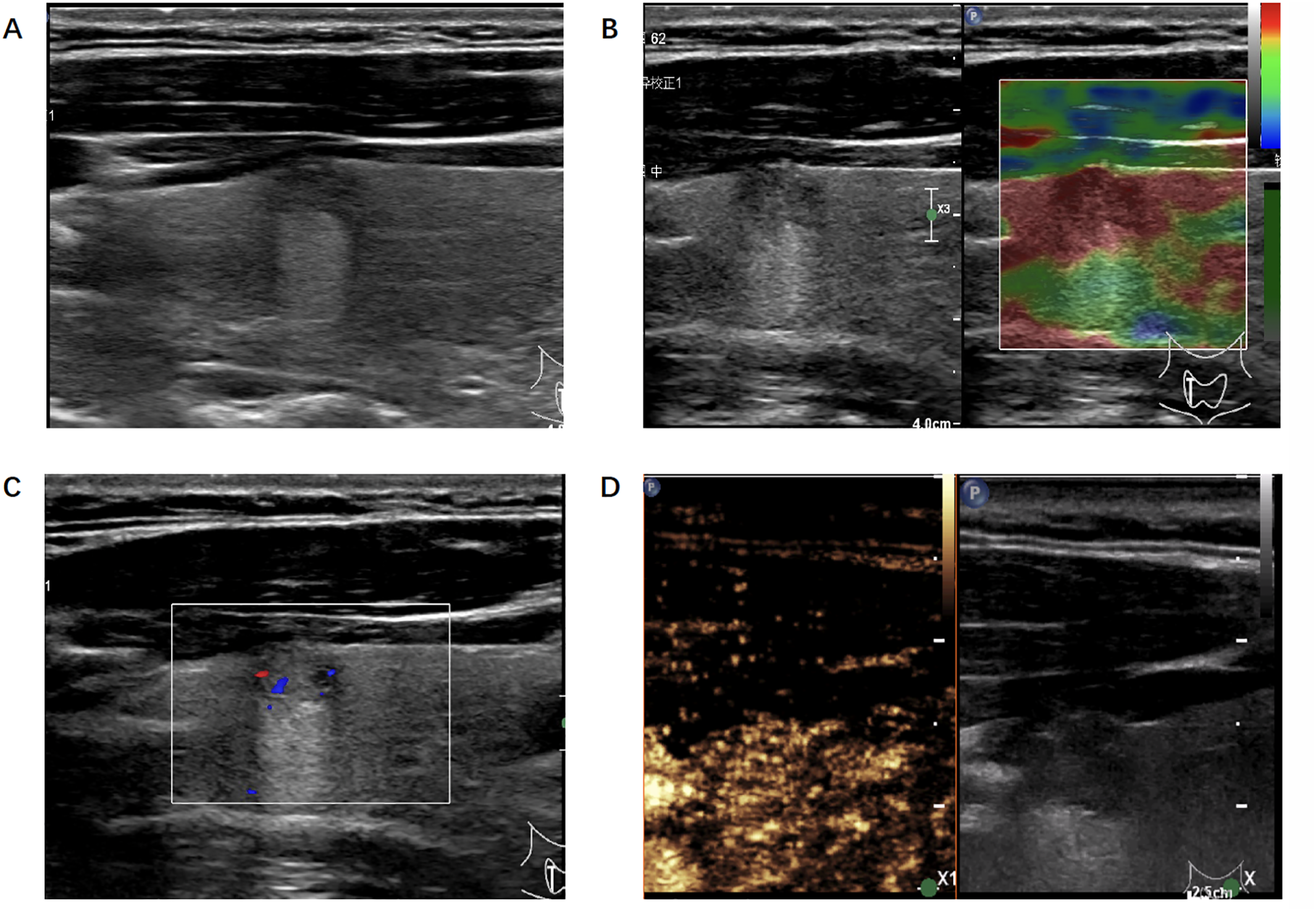 Ultrasonic image of the thyroid nodule which was misjudged by the radiologists but correctly predicted by the algorithm. (A) B-mode ultrasound showed a longitudinal section of the nodule. (B) Real-time elastography image of the nodule. (C) Color doppler flow image of the nodule. (D) The 30-second image of contrast-enhanced ultrasound in thyroid nodule.