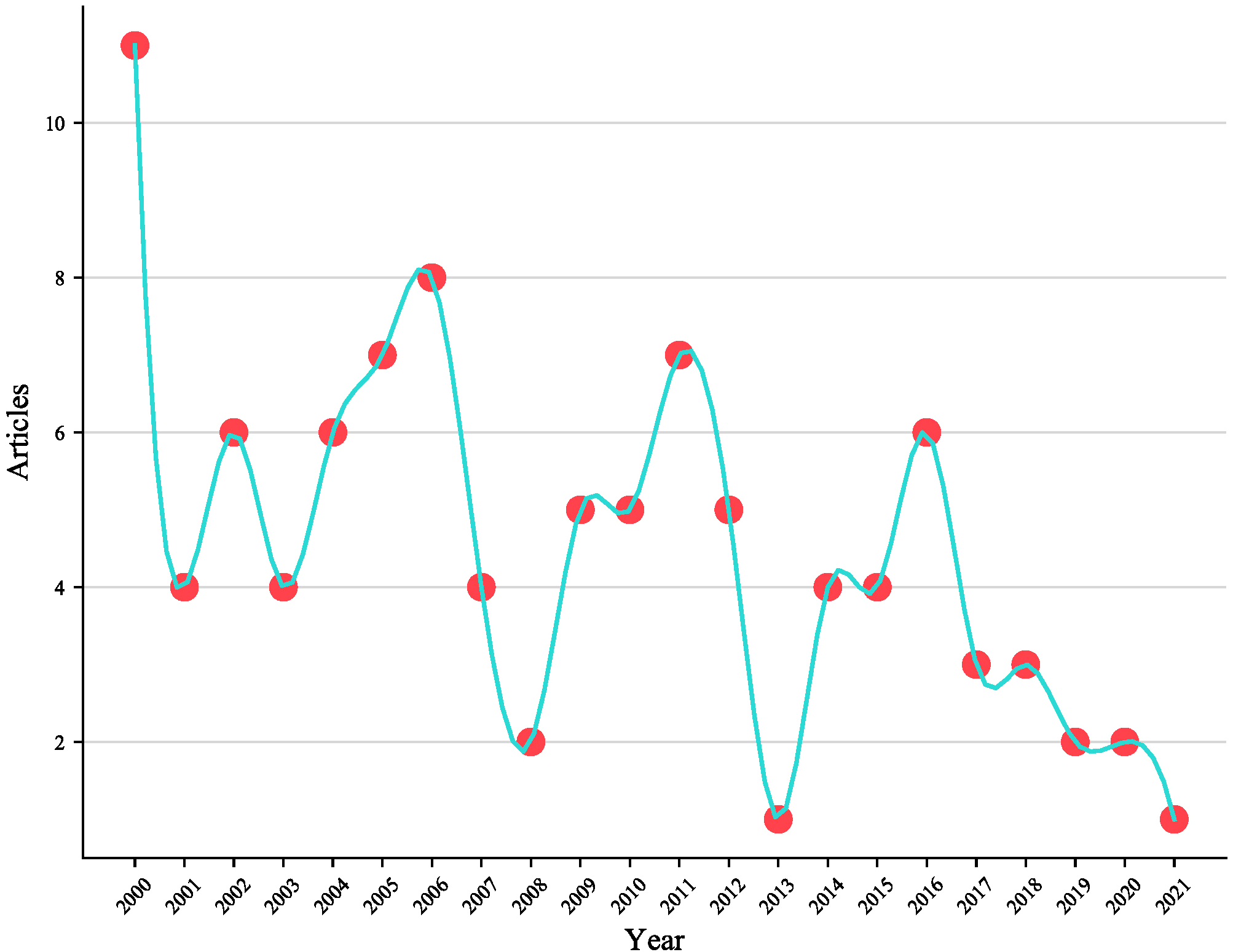 As shown in Table 1, the top 100 most cited articles include 74 original studies, 11 conference papers, and 15 review articles published from 2000 to 2021.The articles came from 50 different journals and involved 653 authors. The publication trend analysis showed that the largest number of articles were published in 2000, followed by a decline of -10.79% from 2000 to 2021. However, there were several significant fluctuations in 2006, 2011, and 2016 (Figure 1). In addition, the proportion of articles that involved international cooperations was as high as 38%.