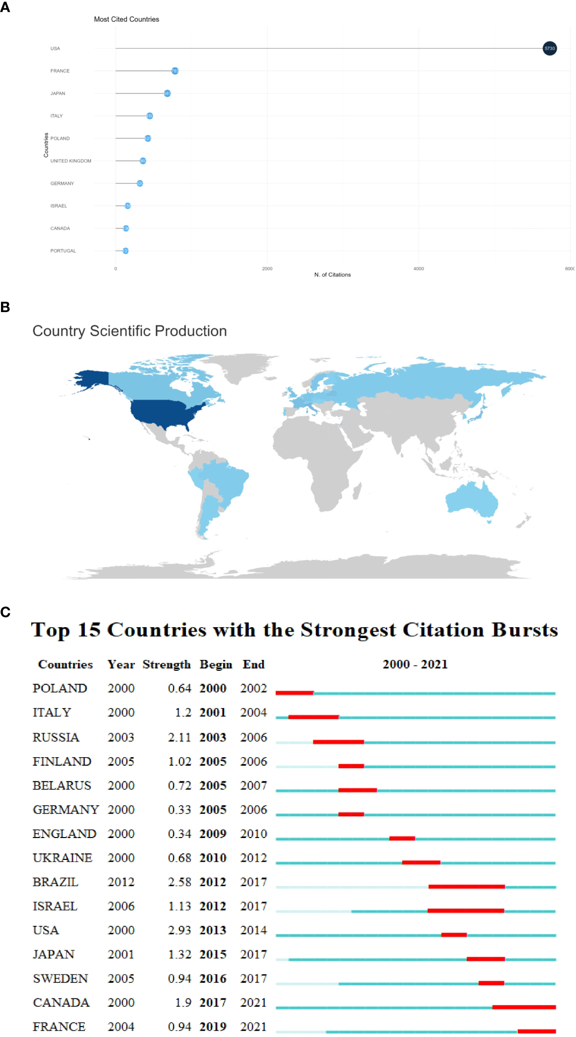 Country-level analysis: (A) Most cited countries. (B) Country research output map. (C) Country emergence.