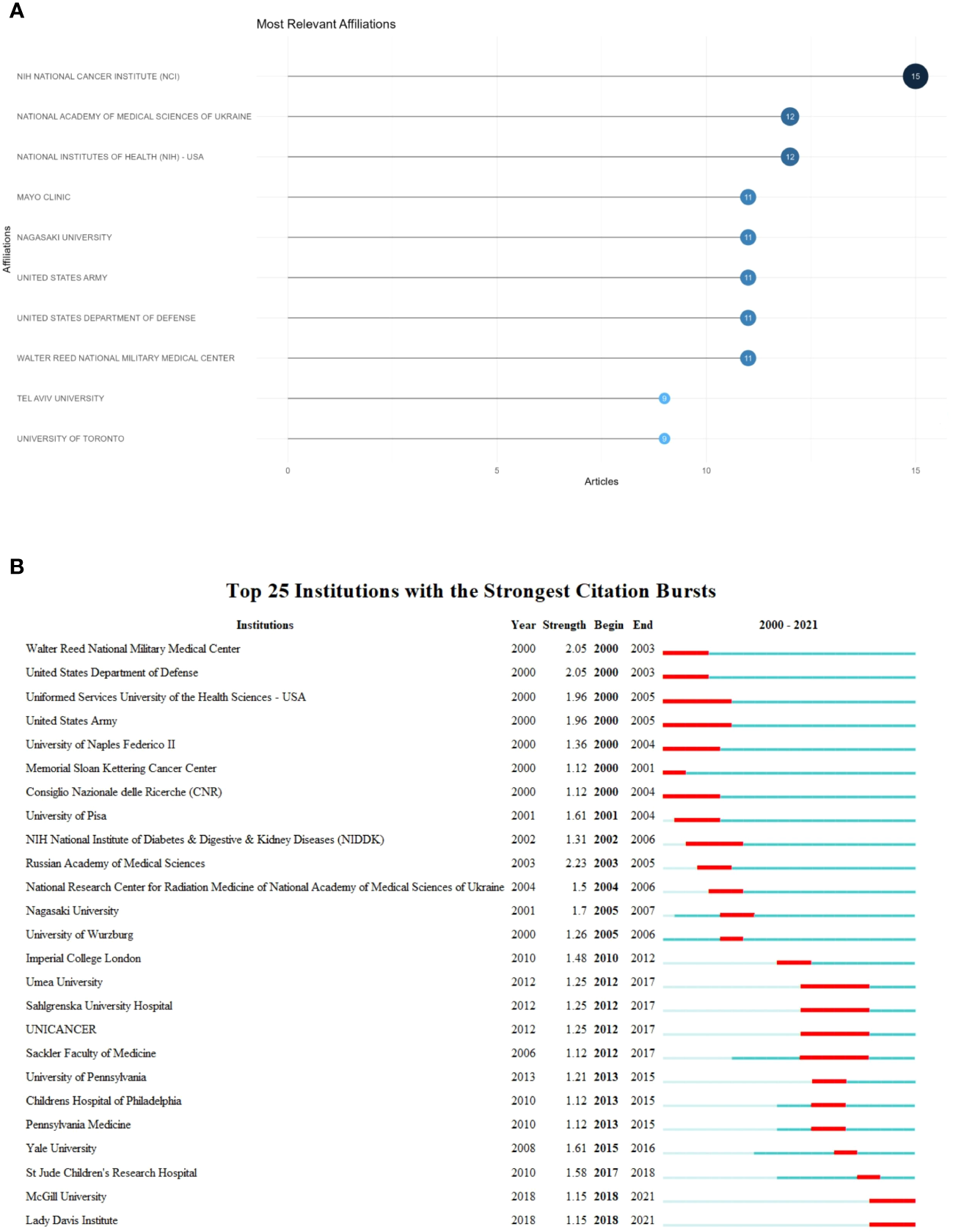 Institution-level analysis: (A) Top 10 most influential institutions. (B) Institutional emergence.