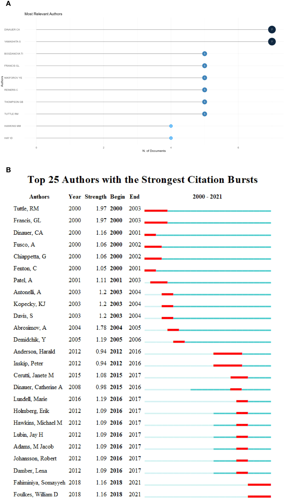 A visualization analysis of the ten most relevant authors showed that Dinauer and Yamashita produced the most articles, with seven publications each. Bogdanova, Francis, Nikiforov, and other authors also made notable contributions (n = 5) (Figure 4A). Emergence analysis of the top 25 authors in Figure 4B revealed that Anderson and Inskip had the longest-lasting impacts. In recent years, Fahiminiya and Foulkes have made significant contributions.