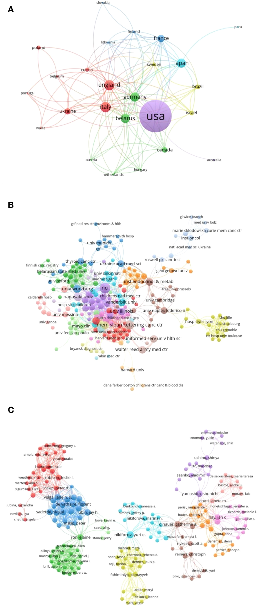 We built a network of cooperation at the countries (Figure 5A), institutions (Figure 5B), and author (Figure 5C) levels, with connections between nodes representing cooperative relationships and node sizes representing the corresponding frequency of occurrences. We found that the cooperation between countries was relatively close, with strong collaboration among countries such as the United States, Germany, England, Italy, Japan, and Belarus. Institutions worked even more closely together than countries did, and at the center of the cooperative network was the NCI. The cooperation among authors was distributed in clusters, with a total of 10 clusters.