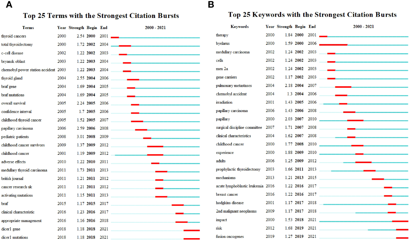 European and American institutions and scientists have made especially important contributions to this research. The NCI has had the largest influence of any research institution and occupies a central position in the research co-authorship network. This is largely due to the agency producing the earliest systematic study of thyroid cancer risk in children and exposure to a dose of I131 (17–22). In addition, it may be related to the breakthrough achievements of the NCI in the detection of genetic mutations in thyroid cancer, such as the discovery that RET oncogene mutations contribute to the use of prophylactic thyroidectomy in children (23). Anderson and Inskip have the longest-lasting research influence in the field. The two have devoted years of research to the risk of thyroid cancer after radiotherapy in children and to cohort analyses, finding that the risk of thyroid cancer after radiotherapy for childhood cancer is significantly increased (6, 24–30). European countries and Japan have also made great contributions to this research field. This is due to the large number of children exposed to radiation and the large increase in radioactive iodine intake after the Chernobyl and Fukushima accidents (18, 31, 32). The cooperation network among authors at the national and institutional levels shows that the research is networked and cooperative, which suggests that scholars interested in this field should strengthen cooperative research. At the same time, researchers can also reference this research to find potential high-quality partners.
