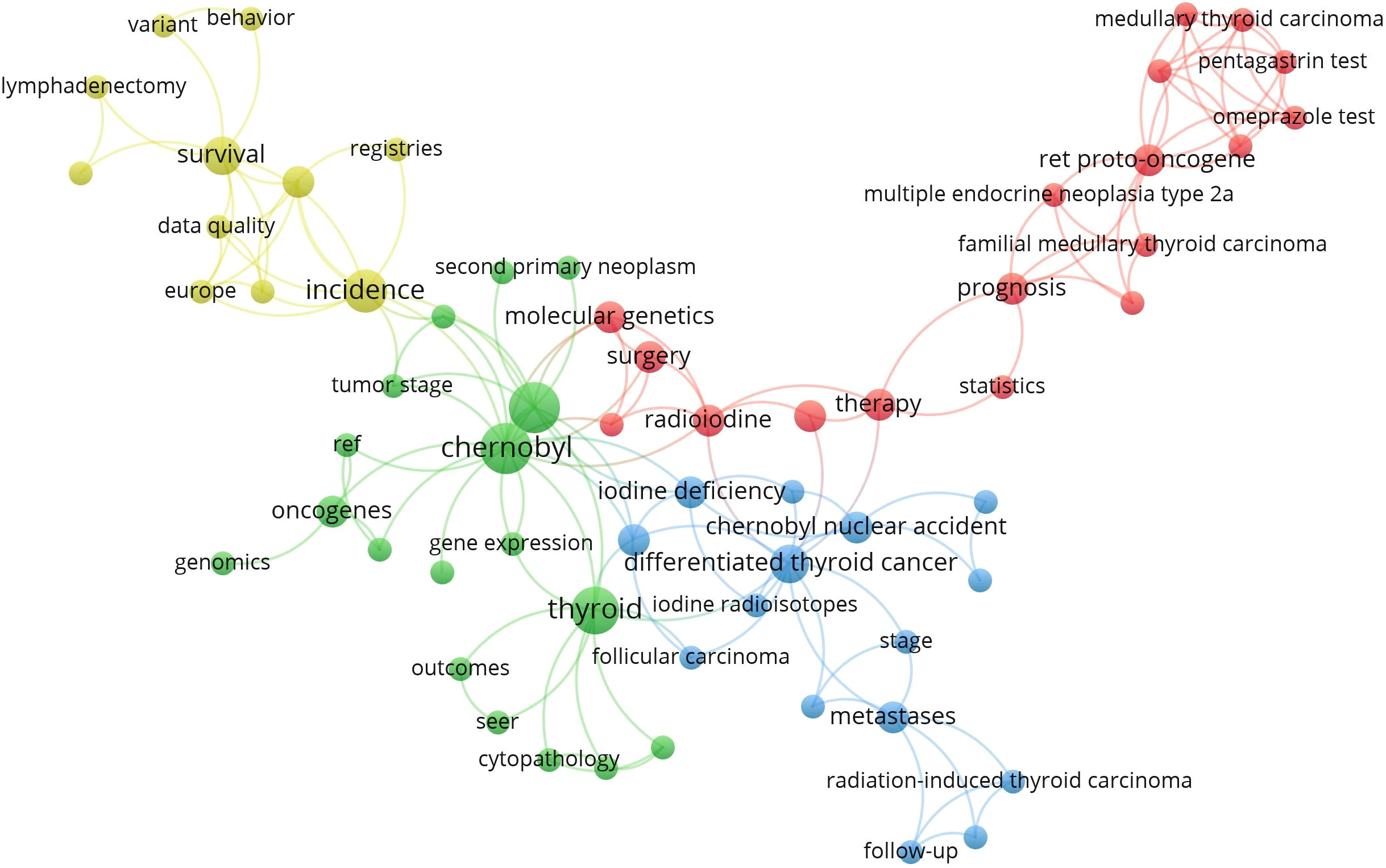 To accurately reproduce the knowledge composition and research framework of childhood thyroid cancer, 62 high-frequency keywords were extracted from 100 articles to construct a coupling network (Figure 7). The coupled networks were divided into four clusters: a green cluster for causes of thyroid cancer in children (such as the Chernobyl incident, oncogenes, and gene expression); a red cluster for the diagnosis and treatment of thyroid cancer in children (such as therapy, surgery, radioiodine, and the omeprazole test); a blue cluster for different types of childhood thyroid cancer (such as differentiated thyroid cancer, radiation-induced thyroid carcinoma, and follicular carcinoma); and a yellow cluster for clinical survival analysis and related experiments (on survival, data quality, registries, etc.).